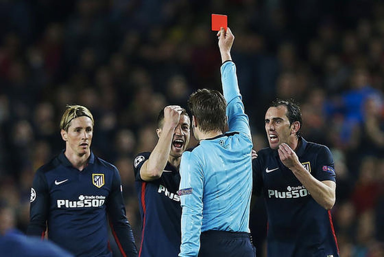 En 25 minutos, el Atlético ya había conseguido su objetivo y el Barça entró en estado de shock, tanto que estuvo a punto de encajar un segundo gol, por medio de Griezmann, aunque esta vez el meta azulgrana estuvo soberbio (min.32). Hasta el final del primer tiempo, el protagonista fue Torres. El autor del gol, que había visto una amarilla en el minuto 29 por una acción con Neymar, jugó con fuego antes de quemarse. El nueve atlético llegó tarde en una acción con Busquets y vio la segunda amarilla. Tendría que jugar su equipo 55 minutos con uno menos. El escenario fue otro, no quedó nada de aquel competido partido inicial. El Atlético, en ventaja, se parapetó en torno a la portería de Oblak, pero apenas sufrió en los diez minutos finales del primer tiempo ante un Barça con demasiadas dudas, ofreciendo un juego muy plano y sin capacidad de sorprender.