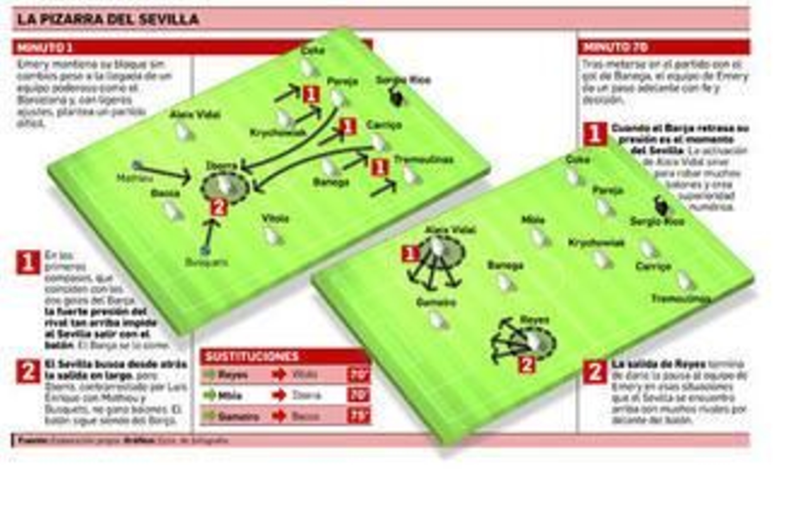Hasta el paso adelante, costó muchísimo trabajo retener el balón arriba. Sólo Bacca parecía capaz, pero sin acompañamiento, pues Banega también necesitaba algún apoyo más. Fue cuando Emery ordenó la presión más arriba cuando el Barça empezó a dudar. El incansable deambular de Aleix Vidal fue animando a otros y fue dando frutos. El Sevilla robaba y se encontraba en superioridad numérica, justo (o algo parecido) lo que antes había hecho el Barça. La salida de Reyes fue el toque mágico para la siguiente fase: ejecutar el último pase.