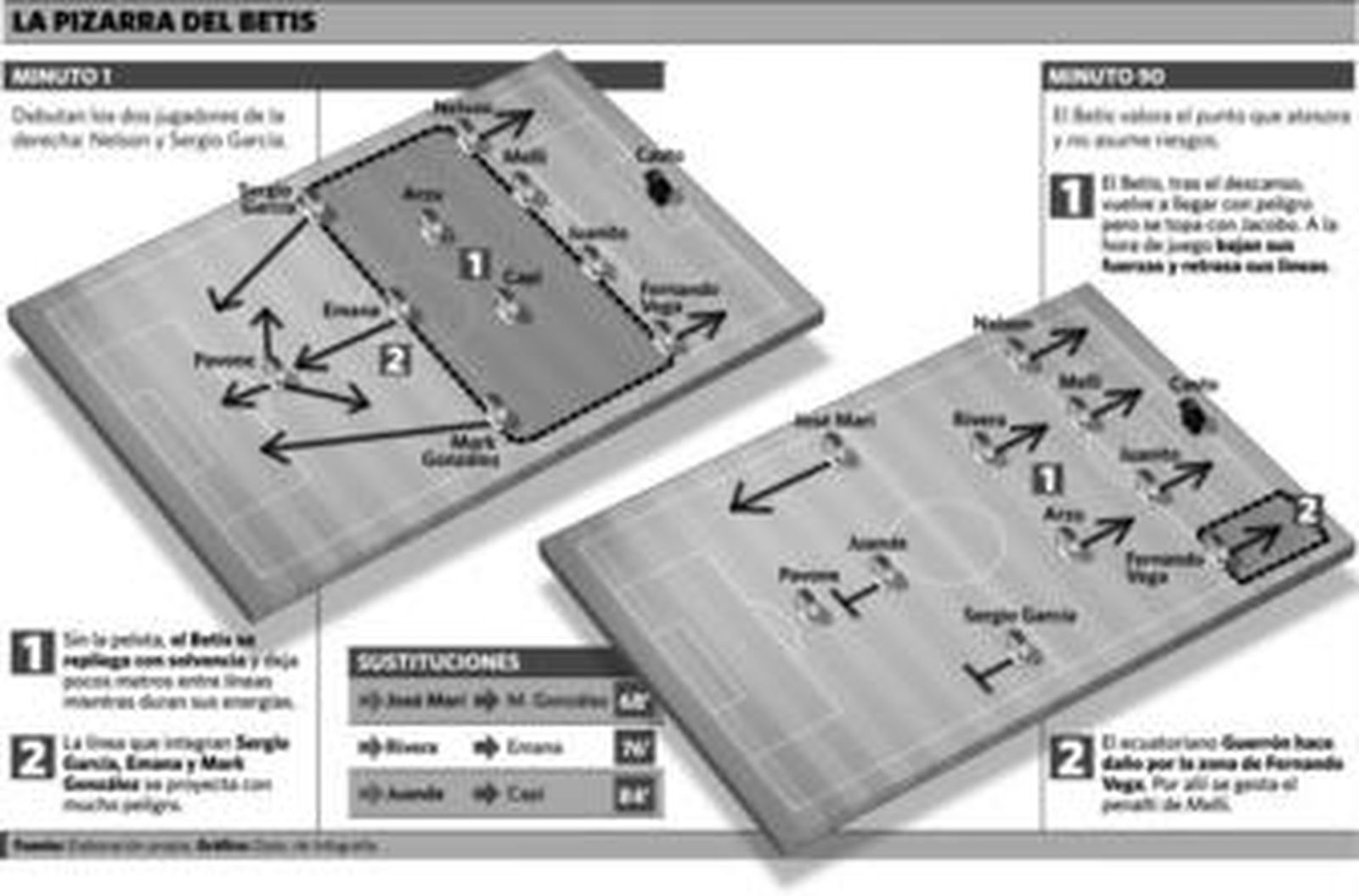 Con la prestancia de Sergio García, Emana y Mark González en tres cuartos de campo, el Betis se ganará mucho respeto en cuanto se vayan acoplando los recién llegados. Tanto el campeón de Europa como el chileno parten desde fuera, pero se incorporan al remate con sentido y calidad, aprovechando los espacios que genera Pavone. Emana irrumpe más por su presencia física, aunque tiende a la dispersión.