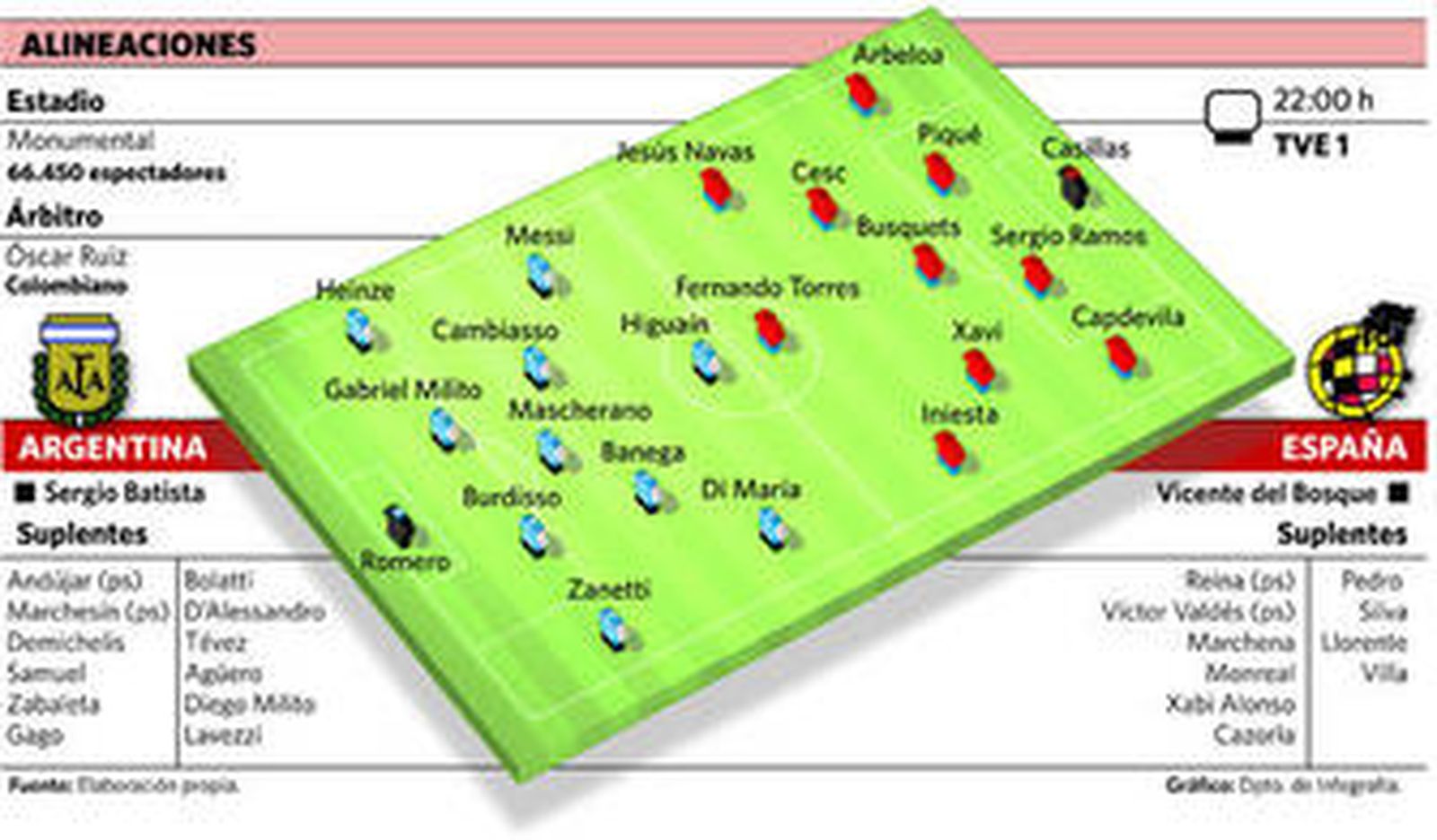 España, en cambio, es un equipo dulce por su catarata de éxitos y visita Argentina sin tensión. Sin el lesionado Puyol, pero con el plantel campeón casi en pleno. Con un recuperado Fernando Torres -autor de un doblete en el 4-0 sobre Liechtenstein del viernes- y un Villa que podría alcanzar -sólo le falta un gol- a Raúl como máximo anotador de la Roja en la historia.