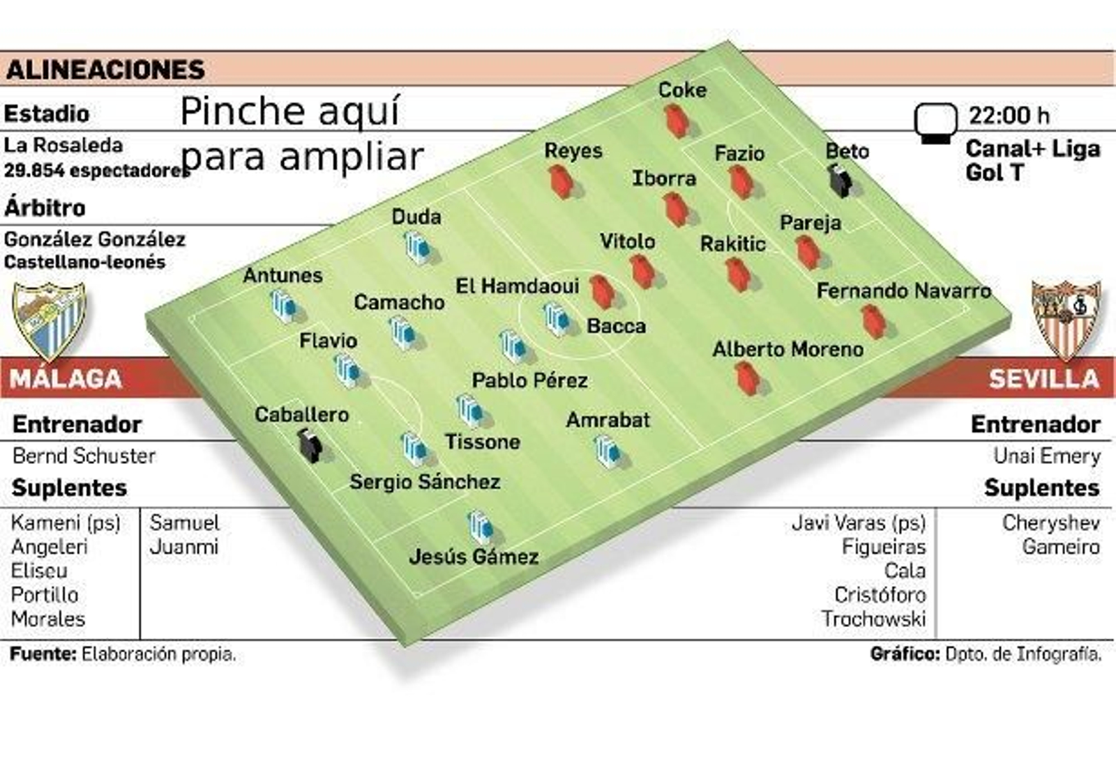 El primero, y quizá más importante, es el once que puede ofrecer el técnico guipuzcoano. Beto llega entre algodones por una sobrecarga en el gemelo y es duda. Además, la baja de Carriço, por acumulación de amonestaciones, se une a la de M'Bia, que no se ha recuperado a tiempo del esguince de rodilla que sufrió en Elche, y esto obligará a Emery a reinventar un plan B. No podrá disponer de dos medios de corte defensivo so pena de arriesgar con el joven e inexperto Cristóforo junto a Iborra, algo que no parece lo más idóneo teniendo en cuenta el escaso protagonismo del uruguayo últimamente. Así pues, en La Rosaleda, el Sevilla no tiene otro remedio que ponerse en el campo con una versión revisada del plan A, con Rakitic junto a Iborra, algo nada habitual a domicilio desde aquel triunfo en Cornellá. Para equilibrar el carácter ofensivo de la medular, Emery podría dar entrada a Alberto Moreno como extremo izquierdo, por delante de Fernando Navarro. Y otra duda que se plantea viendo la convocatoria es si apostará por Reyes como mediapunta junto al carrilero sevillano y Vitolo o tirará de nuevo de Gameiro junto a Bacca para darle más fuerza al ataque.