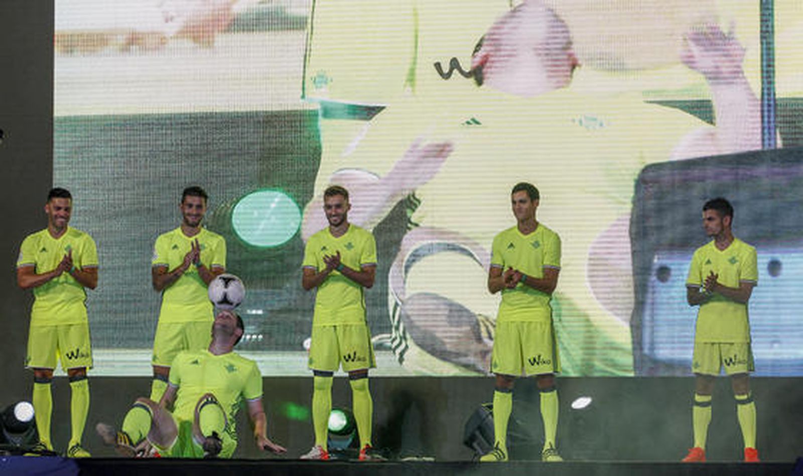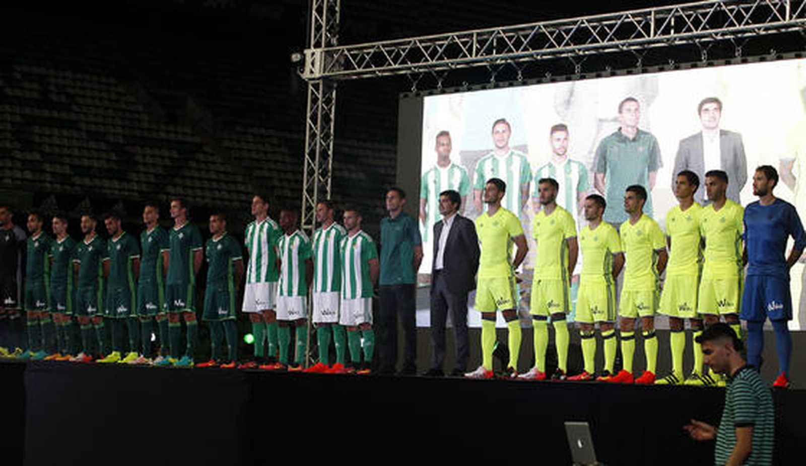 El Betis ha presentado este jueves sus nuevas equipaciones para la temporada 2016/2017 en un acto celebrado en el Benito Villamarín ante 15.000 aficionados. Este año contrasta el clasicismo del primer conjunto con el innovador color del tercero.