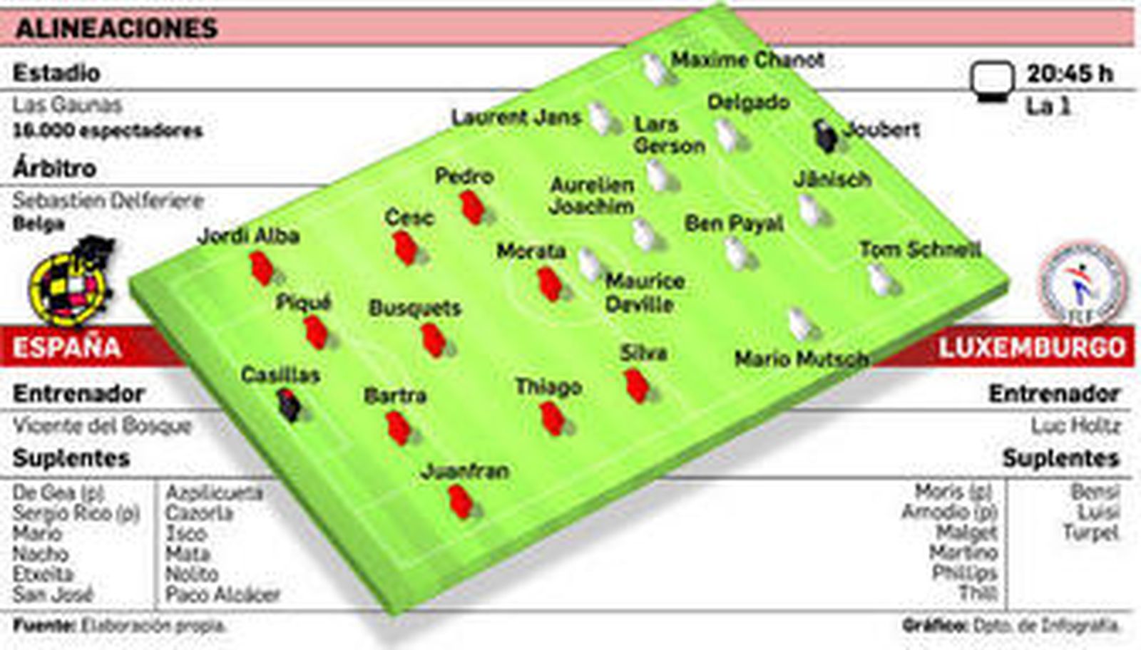 Junto a él estarán los centrocampistas Sergio Busquets y Cesc Fabregas, mientras la punta quedará para David Silva, Pedro y un Álvaro Morata que en ausencia de Diego Costa quiere reivindicar su aspiración de ser el nueve del equipo. Situada en el puesto 142 del ranking FIFA, Luxemburgo vive instalada lejos del milagro de colarse en la fase final de un gran evento desde 1963, cuando llegó a forzar un partido de desempate con Dinamarca para decidir un puesto final en la Eurocopa. El presente lo marca su lucha por conseguir alguna victoria en su grupo y lo ha conseguido en cada uno de sus cuatro últimas fases de clasificación.