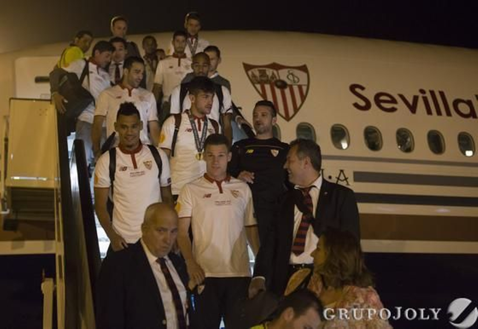 El avión que trasladó al Sevilla arribó al aeropuerto de San Pablo sobre las 05:30 y los jugadores sacaron el trofeo a la pista para dirigirse al terminal, donde numerosos aficionados esperaban con cánticos y gritos. Eran a esa hora numerosos los aficionados que aún esperaban embarcar en el aeropuerto de Basilea ante la saturación de vuelos destino a Sevilla programados para esta madrugada.