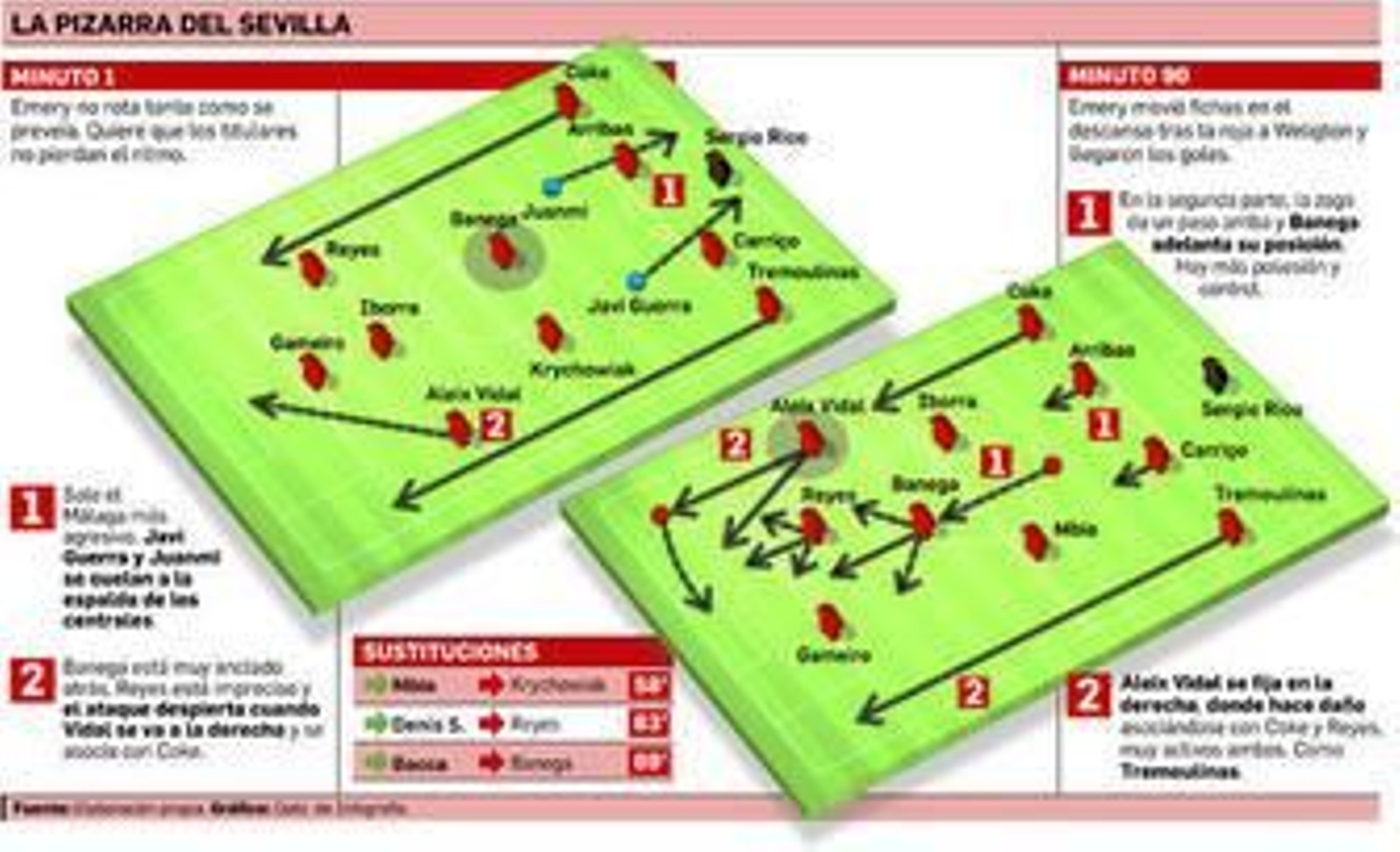 Banega muy anclado atrás, Aleix Vidal tratando de sorprender sin éxito lejos de la derecha, Reyes con cierta desidia, Gameiro e Iborra dejándose llevar... No inquietó el Sevilla a Kameni hasta que el Málaga se quedó con diez. Y ahí, Emery activó su plan en el intermedio: la defensa dio un firme paso adelante, Banega se adelantó 20 metros, Aleix Vidal se centró en hacer daño donde más lo hace, por la derecha, con Coke llegando desde atrás y Reyes desde dentro, como en el 0-1.