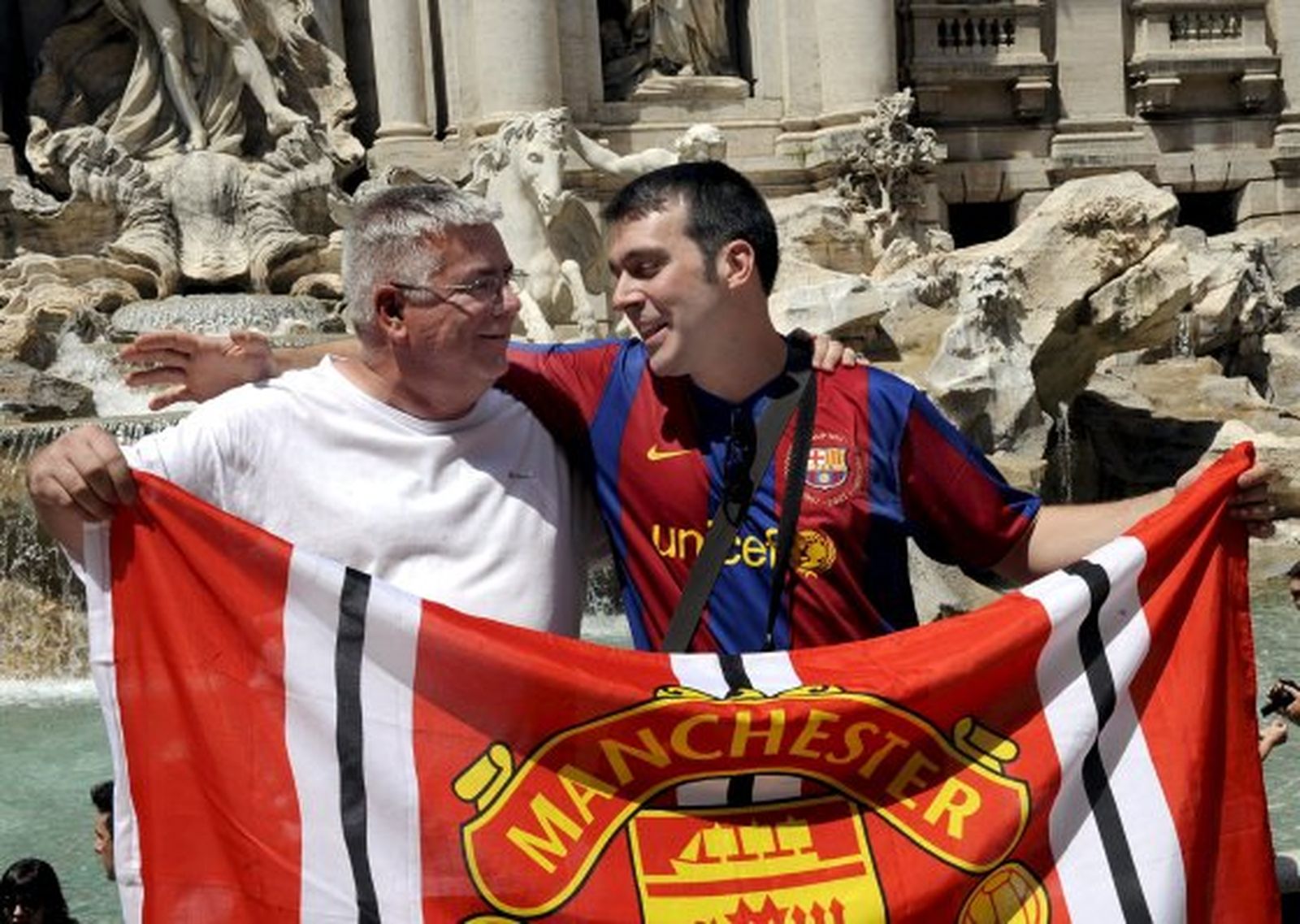 Roma esperaba hoy la llegada de 30.000 aficionados del Manchester United y 20.000 del Barcelona, pero las camisetas del club catalán eran las más numerosas en las principales arterias de la capital italiana.