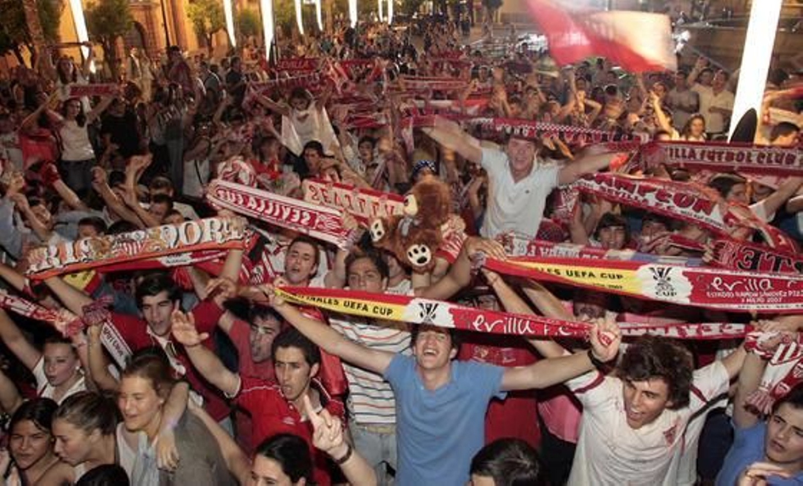 Brindis en casa, en los bares, con los amigos, la familia y para la Puerta de Jerez ataviado con las bufandas, banderas y camisetas del Sevilla Fútbol Club. No había pasado ni una hora de la conclusión de la final cuando los aficionados sevillistas empezaban a reunirse en torno a la fuente de celebraciones blanquirrojas, vallada previamente por la Policía para evitar altercados. No era para menos. Acostumbrados en los últimos tiempos a la inmensa alegría que supone ganar un título, 33 meses de espera merecía darse un homenaje de categoría. "El sevillismo se merecía ganar esta copa", manifestaba un aficionado con el sombrero promocionado por el club entre sus manos.