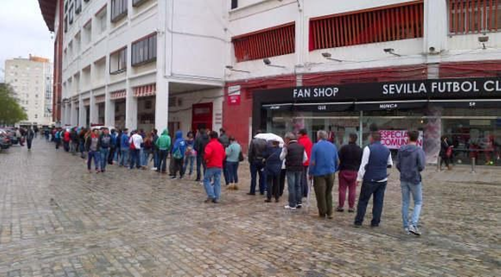 Los aficionados al Sevilla FC han respondido a su club haciendo cola para el partido que enfrentará a Sevilla y Athletic Club de Bilbao el próximo jueves. En torno a la fachada de Preferencia se desplegó una larga cola que llegaba en el momento de apertura de Taquillas hasta la tienda, repleta de sevillistas que se quieren beneficiar de la promoción para acompañantes de abonados totales, que podrán adquirir una entrada por abono al precio de 20 euros. Todo eso, incluso pese a las inclemencias metereológicas con las que ha comenzado este Martes de Feria.