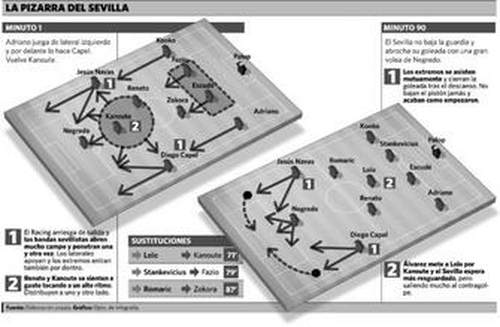 Resultó fundamental que Kanoute se asociara con Renato. Ambos agradecieron que no fueran hostigados casi nunca por unos centrocampistas, los del Racing, que presionaron sin un método, cada uno a lo suyo, y que llegaron tarde siempre a los cruces.