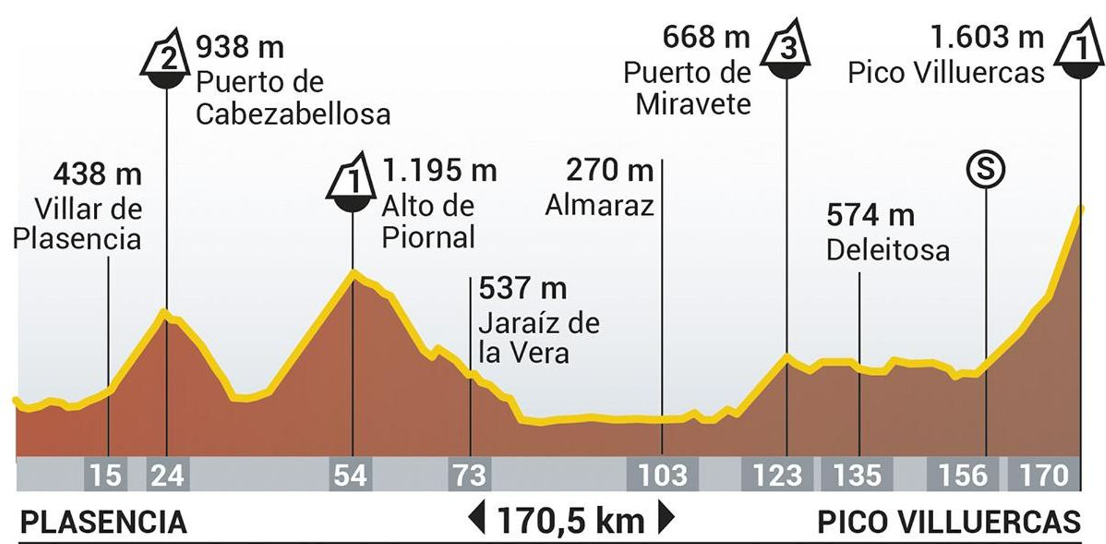 El primer final en alto, y la primera etapa de montaña de la carrera, llega en la cuarta jornada de la ronda durante una etapa que discurre íntegramente en Extremadura, con salida en Plasencia. Son un total de 170,5 kilómetros con un puerto de primera categoría al final, el Pico Villuercas, que presenta rampas del 15 al 16% de desnivel. No es el único puerto del día, hay tres más, entre ellos, el Piornal, de primera categoría también. Será la primera etapa en la que se pueda ver a los favoritos en acción.