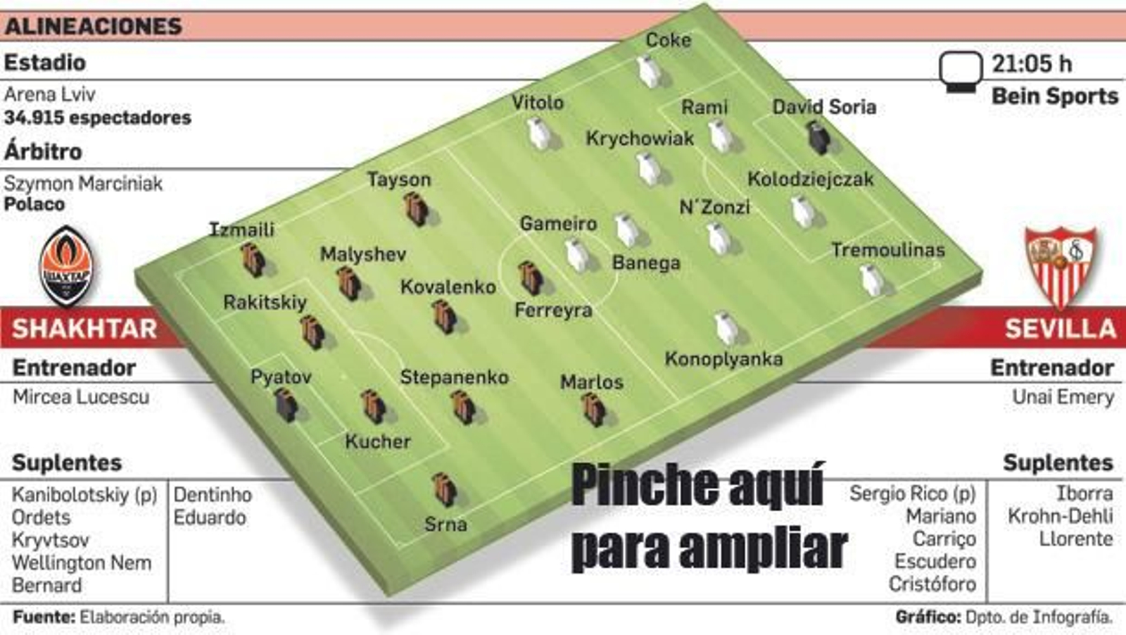 Una vez que están todos recuperados para afrontar esta cita con el Shakhtar, llega la hora en la que Emery debe barajar las cartas para poner sobre el cuidado césped del moderno Lviv Arena a sus mejores naipes. Para empezar, existe la duda en la portería, pues Sergio Rico ha recuperado sus buenas sensaciones, aunque Emery reforzó a David Soria en la rueda de prensa. Después parece que Coke, que fue suplente ante el Betis, será el lateral derecho con los franceses Rami, Kolodziejczak y Tremoulinas en el resto de la zaga. El triángulo N'Zonzi, Krychowiak, Banega es una garantía tanto de equilibrio como de mando y salida del balón en el centro del campo. Con Gameiro como delantero indiscutible, las incógnitas estarían en las dos bandas. Si Vitolo está en condiciones, jugará, mientras que el subidón anímico de Konoplyanka por estar en su país y por ser tratado con la condición de mito parece que juega en favor del esperado extremo ucraniano. Emery no lo dice, pero está deseando que destape el tarro de las esencias y que convierta en efectivo todo lo efectista que apunta.