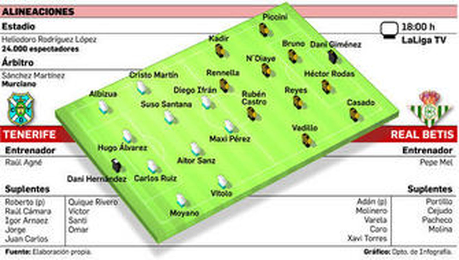 Una de las novedades en el once inicial será el guardameta Dani Giménez, quien debutará en Liga con el Betis tras haber disputado, eso sí, las tres eliminatorias coperas con el equipo, ante Llagostera, Lugo y Almería, un total de 390 minutos.