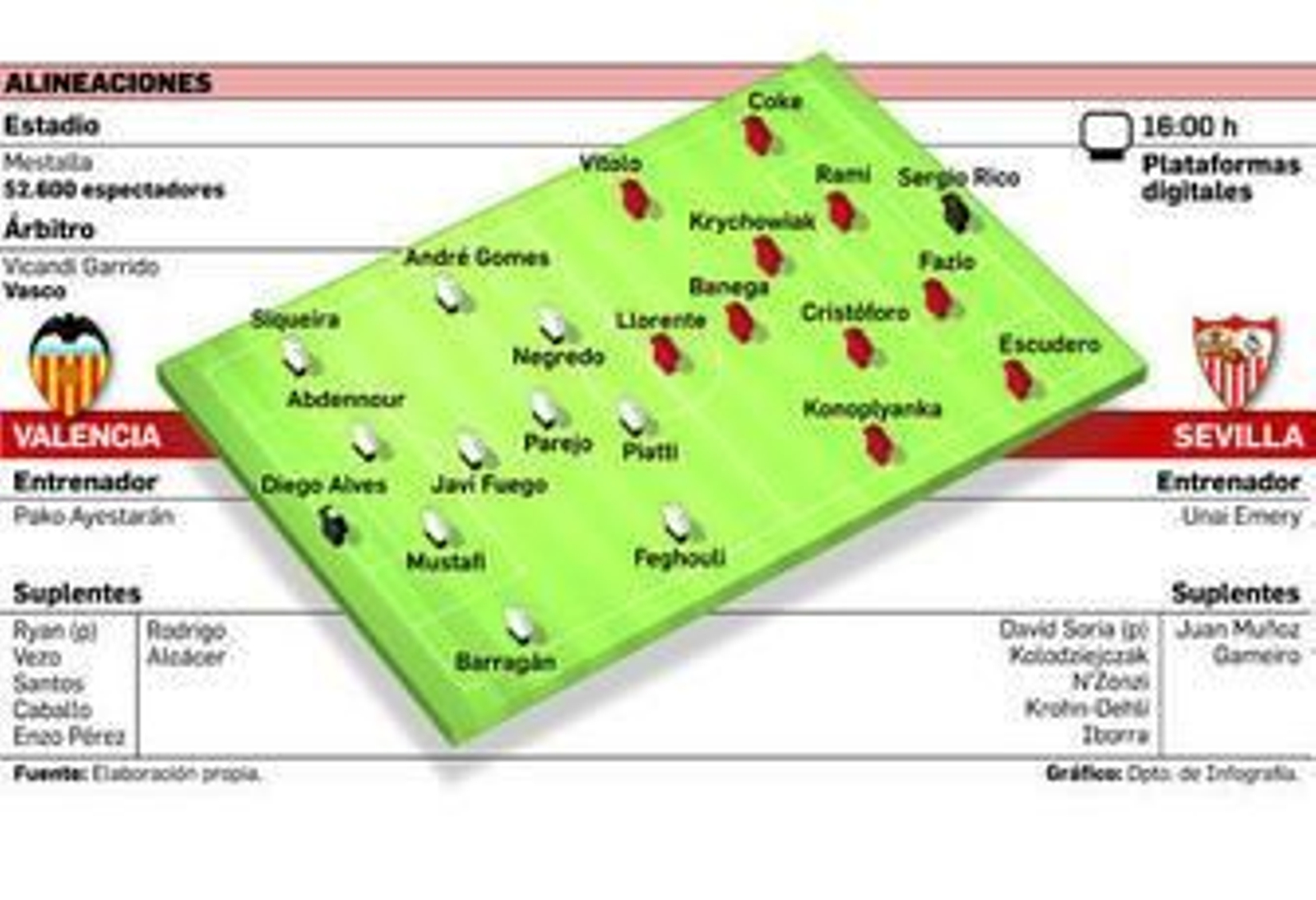 El entrenador vasco pregona una concentración absoluta y todo el respeto a un Valencia con mucha más plantilla que puntos. Pero del dicho al hecho, mediarán las rotaciones: hoy deben volver por decisión técnica Sergio Rico, Cristóforo, Konoplyanka, Llorente. Y si no lo hacen gente como Mariano o Reyes, es porque cumplen sanción por acumulación de amonestaciones.