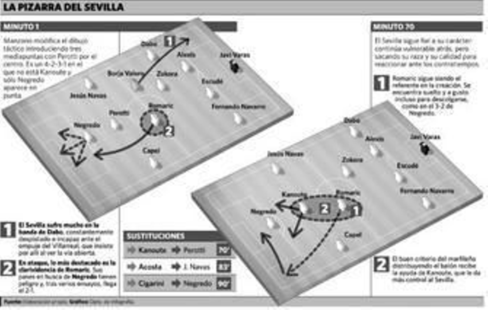 A falta de Kanoute, Romaric se erigió en el líder del equipo. Lo dejaron jugar como a él le gusta, suelto y con comodidad, y así, movió los hilos que llevaron al Sevilla a levantarse y a mostrar su carácter indomable. Ya antes del primer gol de Negredo le puso un par de balones de calidad parecidos, pero terminó de explotar cuando apareció el gigante y se asoció con él. De todas formas, antes también tuvo alguna ayuda de Capel, que se desgastó abriendo espacios con sus carreras. El almeriense fue el más entonado del trío de pequeñitos con que Manzano varió el sistema. Aunque otras veces, con Kanoute o Renato, también había jugado el Sevilla bajo el patrón del 4-2-3-1, en esta ocasión se trataba de tres mediapuntas puros con Perotti por el centro.