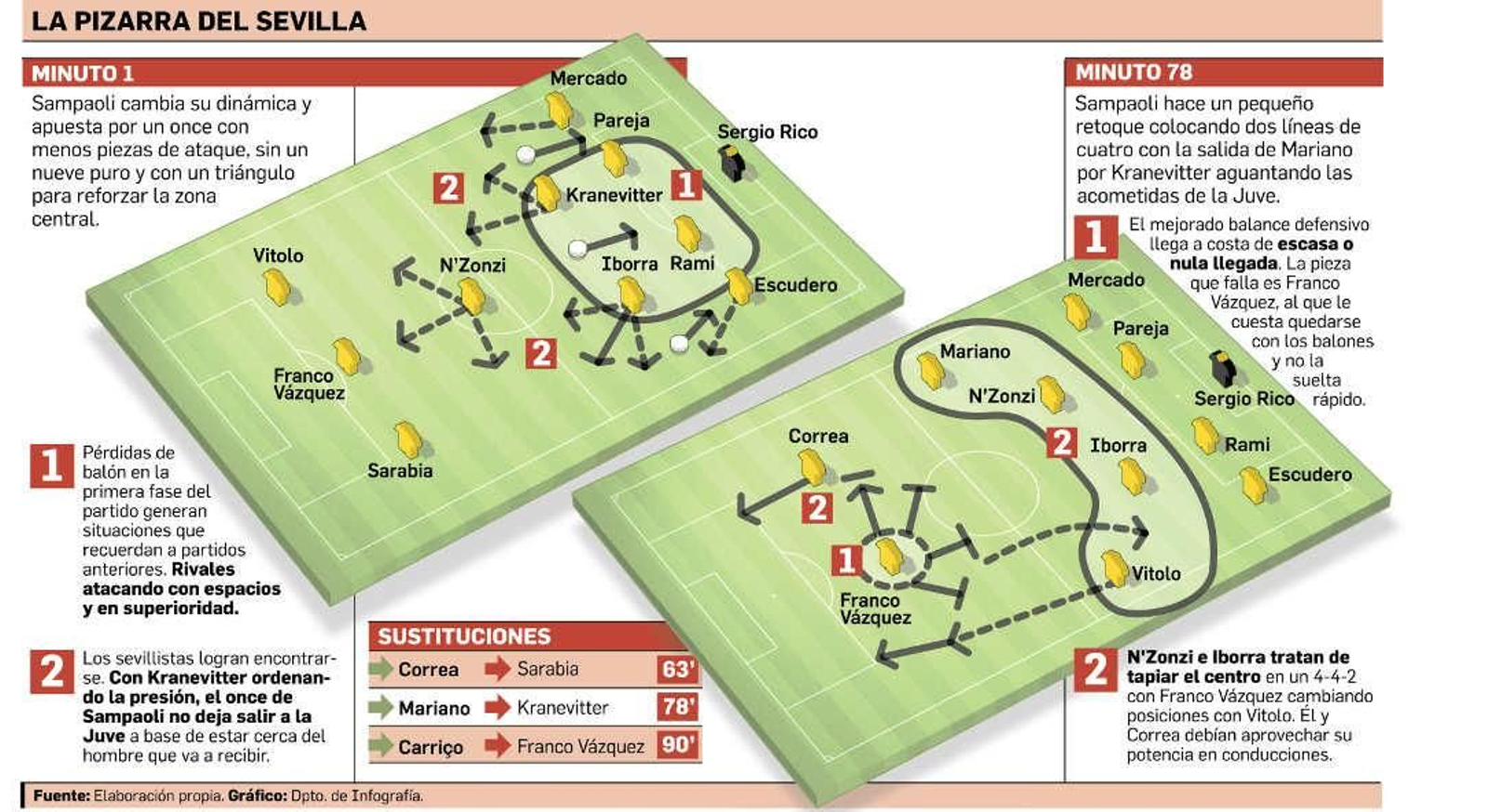 Ante un rival top como la Juventus, Sampaoli olvidó su concepto hiperofensivo del juego. Introdujo muchas más piezas defensivas e incluso reforzó el centro con un doble pivote que junto a N'Zonzi era un triángulo en lugar de un solo hombre (precisamente el francés) en el 4-1-4-1 de los anteriores partidos. Encima, el Sevilla se plantó sin un nueve en su alineación (tampoco salió en el transcurso del choque).