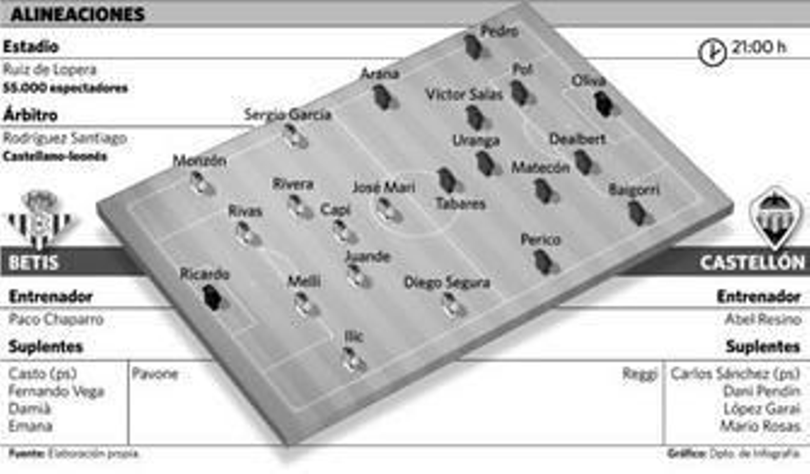 La tercera cuestión que debe evitar la relajación la marca el encuentro de ida, donde el Castellón se mostró superior por momentos al Betis, aunque el marcador dictara sentencia a favor de los intereses verdiblancos. Chaparro espera que el equipo sea capaz de mantener un mayor control del juego y, a la vez, que aproveche los espacios que se generen en la defensa visitante, que aumentarán con el paso de los minutos. La movilidad de Sergio García, José Mari, Diego Segura o Capi debe aportar el suficiente dinamismo para brindar una buena noche de fútbol a la parroquia bética, tan necesitada de la misma.