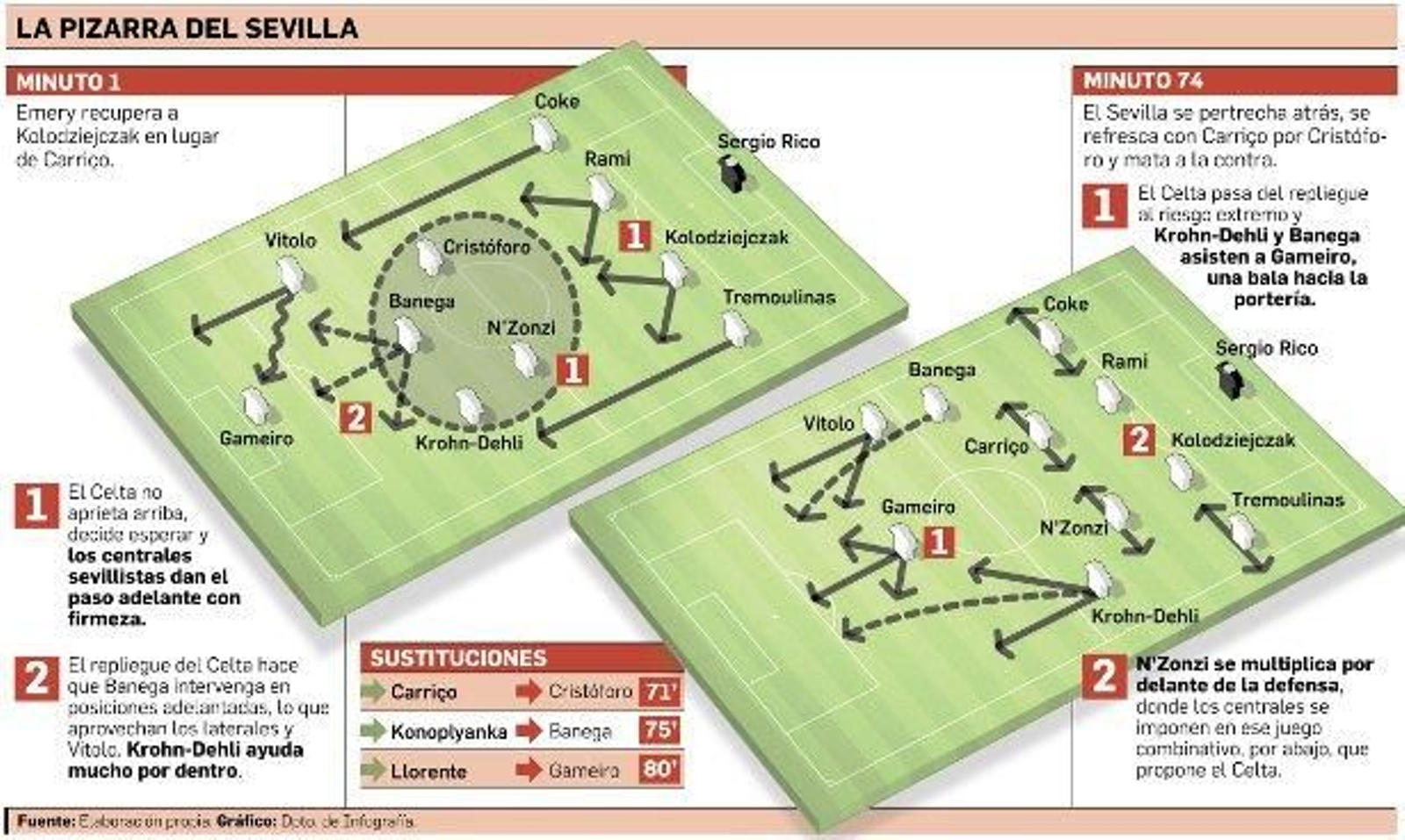 Tremoulinas tuvo además todo el carril para él: Krohn-Dehli jugó mucho más por dentro que junto a la cal para crear superioridad. Fue clave el danés para que el Sevilla sostuviera su dominio, percutiera una y otra vez y forzara jugadas a balón parado en busca de ese primer gol. Se asoció en corto con todos, mientras Banega sufría más la atosigante marca de los rivales, como ya ordenan todos los entrenadores del rival. Vitolo también es un jugador que se maneja muy bien en la distancia corta, entre un bosque de piernas. Siempre encuentra un hueco y se va. También ayudó a enfrascar al Celta muy atrás.