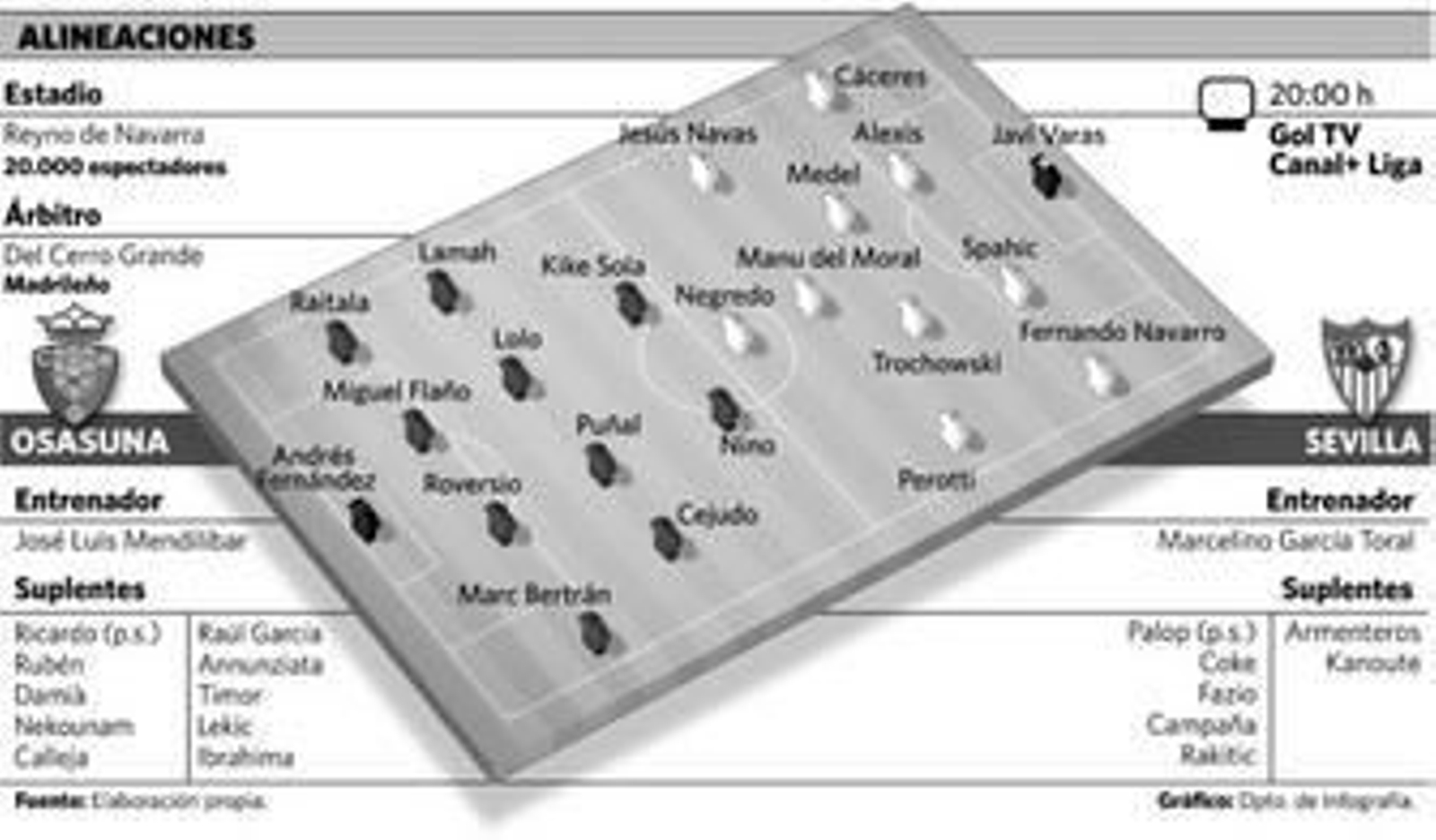 El asturiano insiste sobre dos o tres ideas básicas y las machaca: solidaridad, convicción, presión, unión de líneas... Es decir, mensajes dirigidos más a la actitud que a la aptitud táctica. Pero eso no significa que desprecie la estrategia para combatir las virtudes del rival, que las tiene. Mendilibar ha dotado a Osasuna de un juego menos directo y más de combinación, aunque siempre sobre la idea matriz del dinamismo. Y cuenta con piezas para llevarlo a cabo. El Sevilla debe vigilar el oportunismo del incombustible Nino, y el habitual dinamismo de Kike Sola, artífice de la remontada local el curso pasado, y el técnico también ha avisado de la capacidad de desborde del marfileño Lamah, otra de las escasas novedades de los rojillos. Puñal y Lolo, arraigado en Navarra, meterán fuerza en la medular... Por nombres, a lo que se ve, gana el Sevilla, como suele pasar en las previas de los partidos en Pamplona. Luego el fútbol tiene caminos inescrutables, a no ser que la unión de carácter y talento logre plasmar la lógica de que gana el más fuerte.
