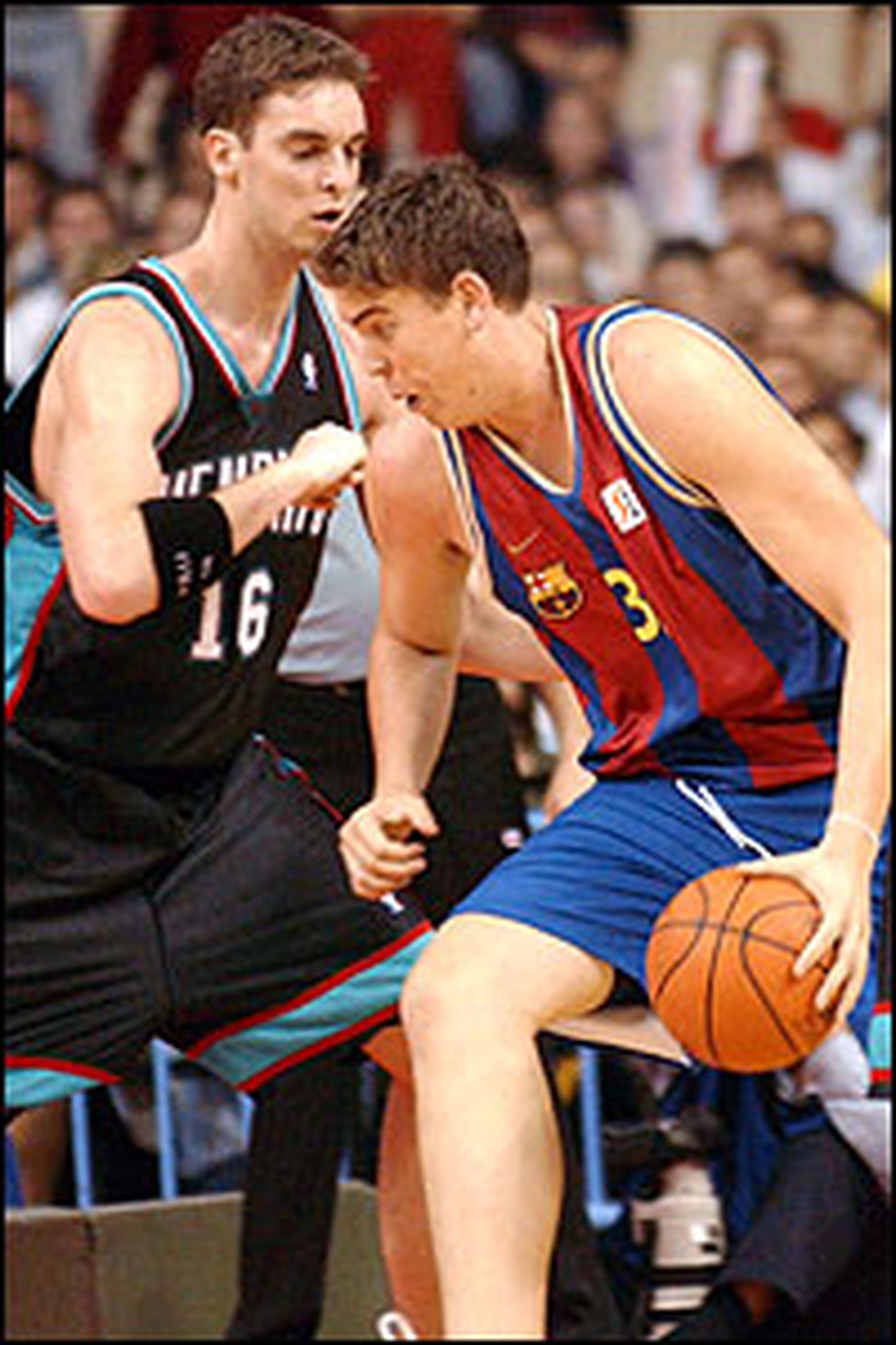 Un único enfrentamiento en el amistoso Barça-Memphis de 2003. Los trayectoria de los hermanos Gasol, a pesar de correr, en muchos aspectos, en paralelo, no les ha permitido compartir equipo más que en la selección nacional. Cuando Pau estaba en el primer equipo azulgrana, Marc militaba en el filial de la EBA; cuando el menor de la saga debutó en la ACB, el mayor ya era una estrella de la NBA. Así, hasta el 26 de julio de 2006 no compartieron equipo. Ocurrió en Córdoba y durante todo el verano de 2006, dentro de la selección española que fue campeona del mundo. En todo caso, no llegaron a compartir cancha hasta el Eurobásket de 2007, donde la progresión de Marc y la lesión de Garbajosa permitió ver a los hermanos juntos. Su único duelo directo se produjo en el Palau Sant Jordi el 10 de octubre de 2003, en la visita de los Grizzlies a Barcelona. El equipo NBA ganó 80-91 al entonces campeón de Europa con 18 puntos y 9 rebotes de Pau y 2 puntos del entonces bisoño Marc, que estaba muy lejos de ser el jugador que hoy es. Por aquel entonces, el actual center de los Grizzlies venía de jugar dos años en un High School de Memphis y de disputar, en agosto de ese mismo año, un torneo 3x3 en Calafell, la población de la costa de Tarragona en la que la familia Gasol veraneaba antes del salto a la fama de sus vástagos.