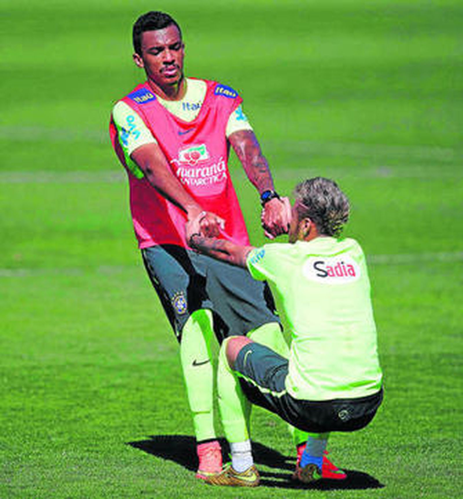 Luiz Felipe Scolari mostró sus preferencias por Fernandinho, al tiempo que respiró por la recuperación del estado de Neymar, tocado durante los días pasados. El astro brasileño dio síntomas de normalidad, sin aparentes dolores ni el vendaje que hasta el martes llevaba en la rodilla derecha como protección. Protección de las secuelas de los golpes recibidos en el choque ante Chile.