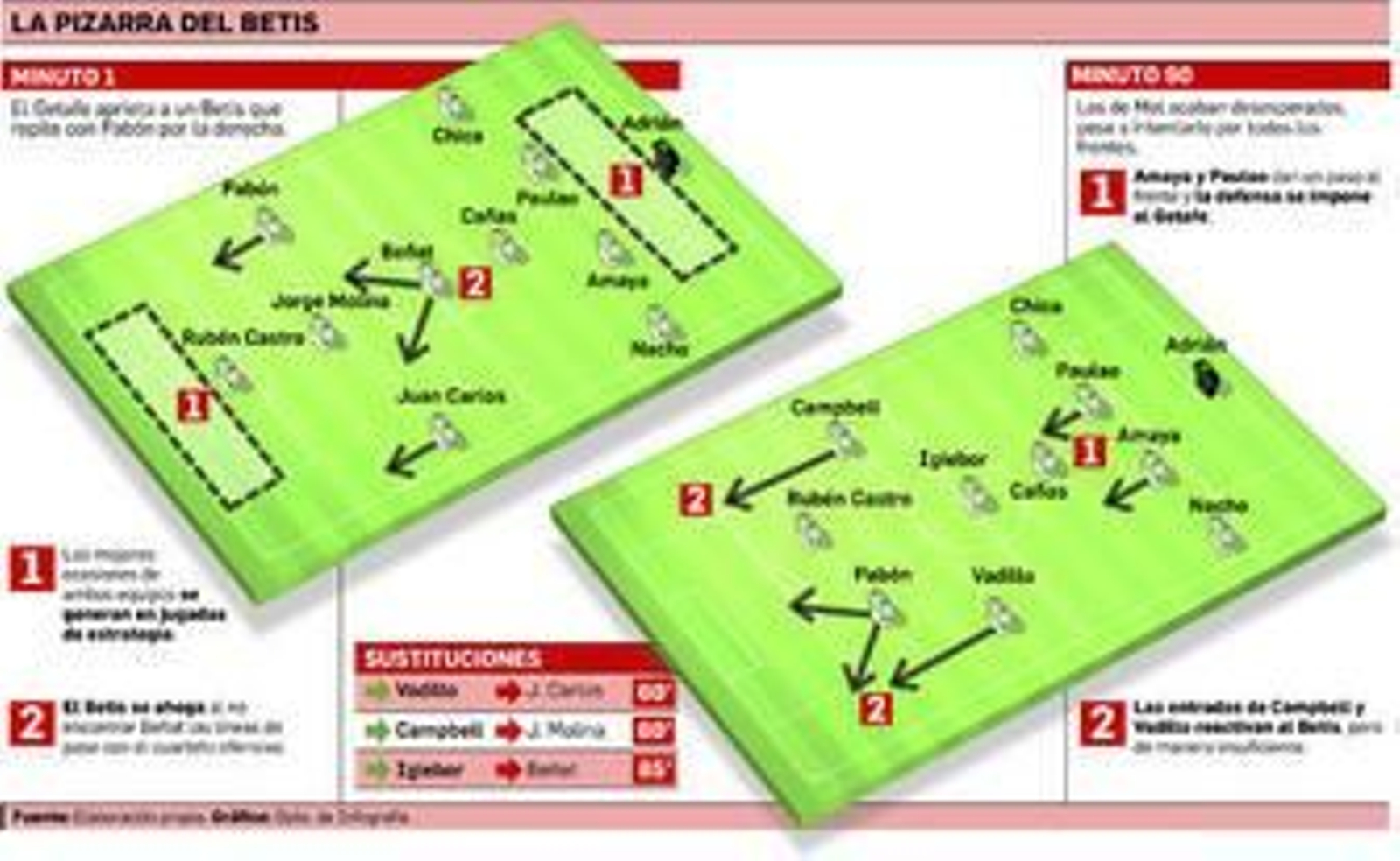 Con el tridente más Juan Carlos, los de Mel se mostraron menos activos que cuando Vadillo y Campbell entraron por el madrileño y Jorge Molina. Y es que Pabón, voluntarioso en la banda, genera mucho más peligro jugando por dentro. Suya fue la mejor ocasión bética, aunque le falta compenetrarse mejor con el ayer casi desaparecido Rubén Castro.