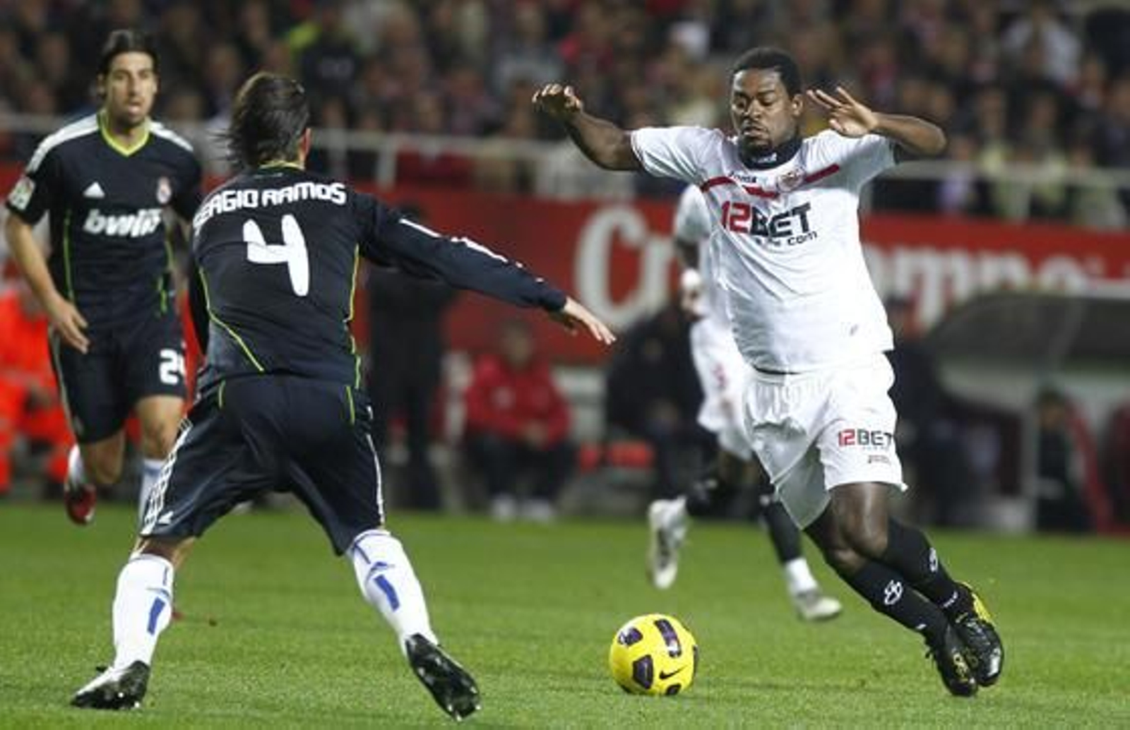Claro que merece la reprobación más absoluta este lanzamiento y desde aquí sólo queda sumarse a ella, mas tal vez sea preferible centrarse en lo que había sucedido en el terreno de juego. Y el arranque conduce al análisis de lo que se generaba en la pizarra de ambos equipos. Gregorio Manzano optó de salida por un planteamiento valiente, con esos cuatro delanteros a los que parece condenado este Sevilla por su éxitos pasados. Es cierto que Kanoute retrasaba algunos metros su posición, pero la cabra siempre tira al monte y el gigante francés es un delantero más tanto en el fondo como en la forma. Por ahí comenzaba, por tanto, a ganar la batalla un José Mourinho que sí apostaba por equilibrar más a los suyos. Tres centrocampistas preparados para correr, con más pinturas de guerra, seguro, de las que se exhibían en el famoso anuncio. Xabi Alonso, Khedira y Lassana Diarra se hartaban a correr para ayudar tanto delante como detrás y la tarea de arriba se fiaba a la genialidad en una contra de Özil, Benzema y Cristiano Ronaldo.