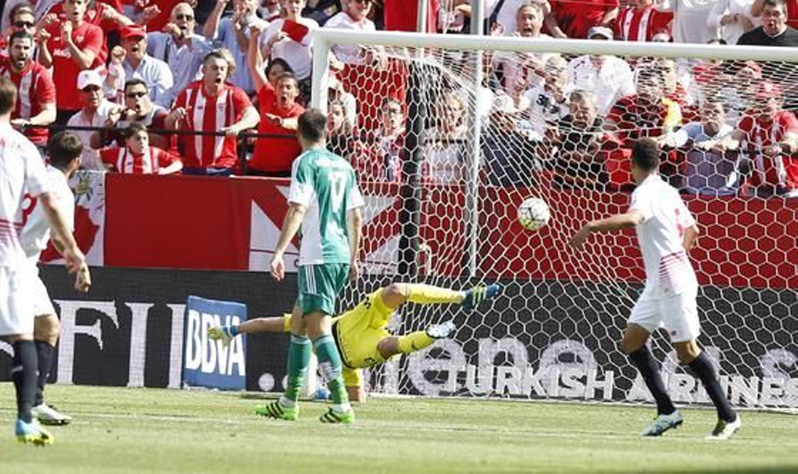 Con semejantes actores, si el Betis no había tenido peligro en sus acercamientos hasta Sergio Rico más allá de una salida del guardameta que dejó el balón muerto al no poderlo retener, no se puede decir lo mismo de las llegadas del Sevilla. Ya en el minuto 19, cuando daban sus últimos coletazos las intentonas verdiblancas en este primer periodo, Mariano tuvo todo a su favor en un cabezazo en el segundo palo completamente en solitario tras una buena jugada entre Banega y Gameiro, pero el brasileño no acertó con la portería defendida por Adán. Después se sucederían varios remates locales en acciones de estrategia, pero que fueron mal ejecutados por Konoplyanka, Banega, Gameiro y otra vez el ucraniano cuando tenían opciones de hacer más daño.