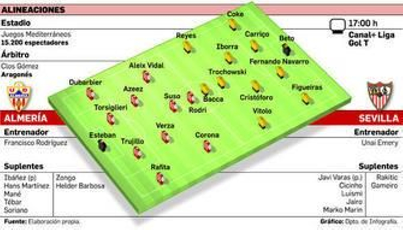 El rival, con urgencias, no está en un buen momento, pero engaña. Con muy buenos jugadores como Suso y Aleix Vidal, el Almería no es que no haya perdido en ninguno de sus cinco últimos partidos en su estadio, sino que tampoco ha recibido ningún gol. Ya en la primera vuelta en Nervión dio otra imagen muy distinta de lo que marcaba la clasificación entonces. Con Francisco en el alambre, hacía más fútbol que resultados y perdió aquel partido en el último segundo tras un cabezazo de Rakitic en casi la última jugada de mérito que se le recuerda a Marko Marin. Ese tanto, el 2-1, desataba la rabia de Emery, ya muy discutido por entonces, que se subió prácticamente encima de sus jugadores para celebrar el triunfo. No era para menos: su equipo dos semanas atrás era el colista de la tabla.