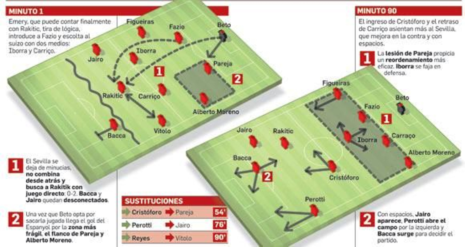 La doble pareja de medios formada primero por Carriço e Iborra, y después por Cristóforo e Iborra tras la lesión de Pareja le dio al Sevilla el empaque necesario para acudir con fuerza a multitud de balones divididos y a llenar de obstáculos la zona de creación del Espanyol. El Sevilla salió con las líneas adelantadas y pobló el mediocampo de piernas y cabezas, en un partido que tuvo mucho de juego aéreo por las características de un rival que va al choque. Y ahí ganó casi siempre el Sevilla. Y además Fazio, arropado por los medios, se convirtió en un muro infranqueable que escupió a la primera multitud de balones. En general, la defensa se olvidó de la manía de jugar con Beto, sobre todo a raíz de que uno de sus saques propiciase el 1-2.