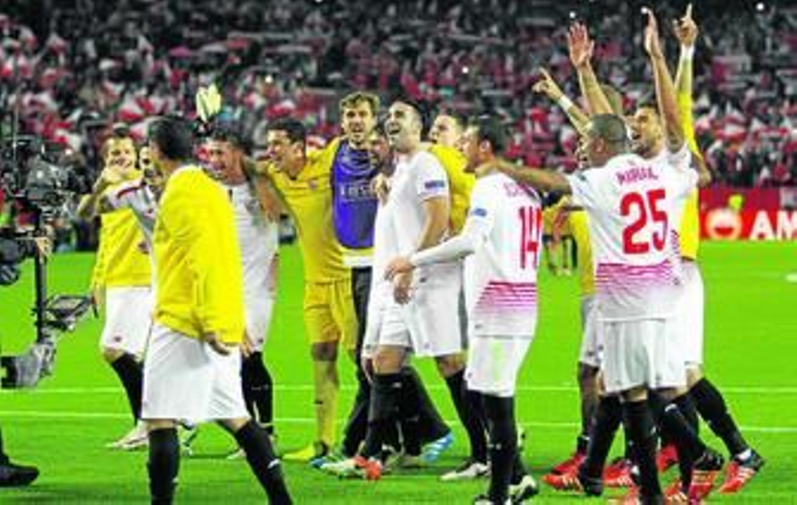 Los jugadores del Sevilla festejan la clasificación para la final de Basilea.