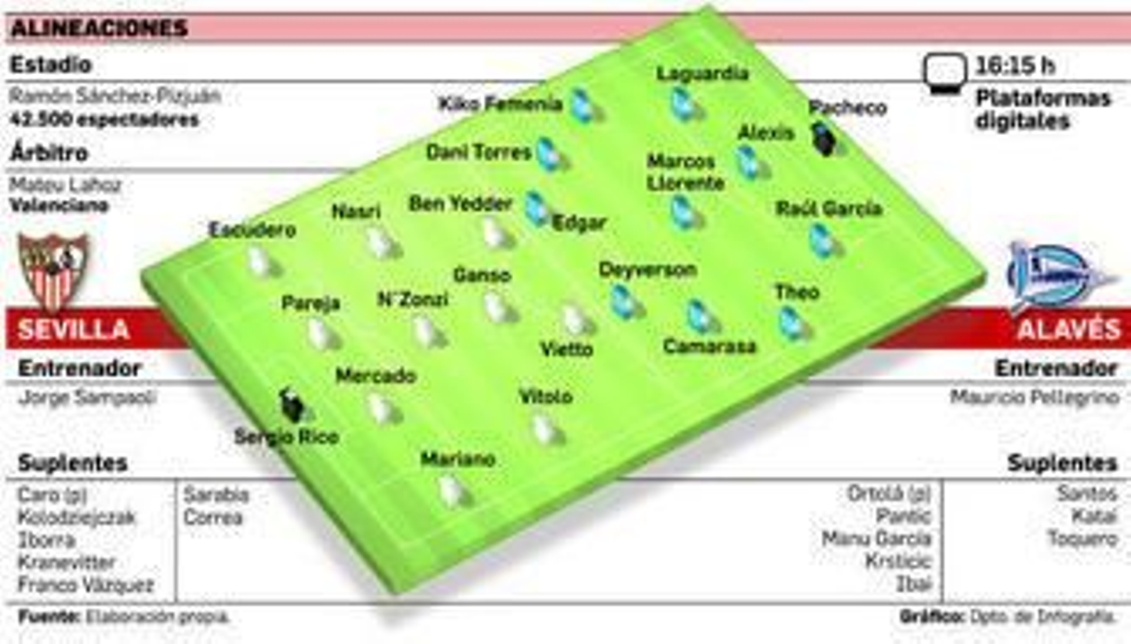 El Sevilla busca ratificar la grata mejoría ofrecida ante el Lyon frente a un Alavés que llega como equipo revelación Ganso puede irrumpir pese a la anunciada continuidad del once