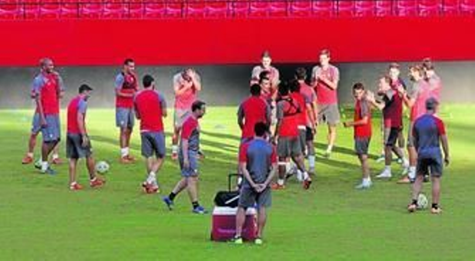 Los futbolistas sevillistas aplauden tras realizar un ejercicio de calentamiento en la sesión preparatoria en el Sánchez-Pizjuán.