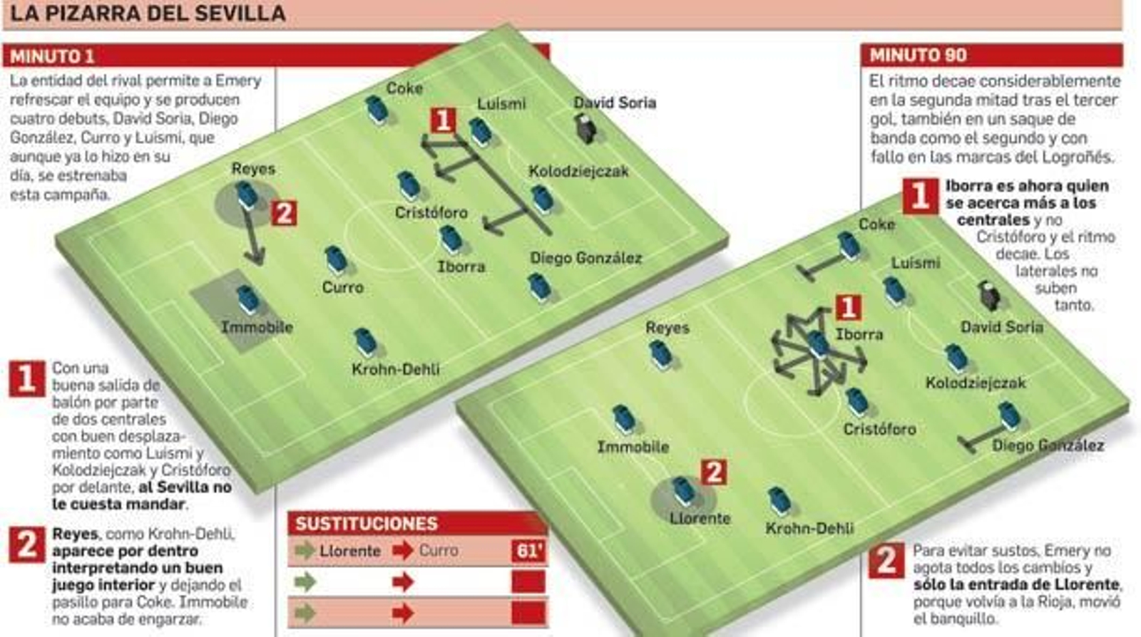 Con Reyes como faro metiéndose hacia adentro y dejando el pasillo a Coke y Krohn-Dehli haciendo algo parecido en la izquierda, al Sevilla le fue fácil someter al Logroñés, que lo puso en bandeja desajustando las marcas en la estrategia. Dos goles en saques de banda y en un saque de esquina con cada par perdido al primer movimiento (ya fuera un arrastre o un balón rebotado) fueron suficientes. En la segunda mitad casi no hubo partido y la salida de Llorente no alteró nada pese a la ligera variante en el esquema.