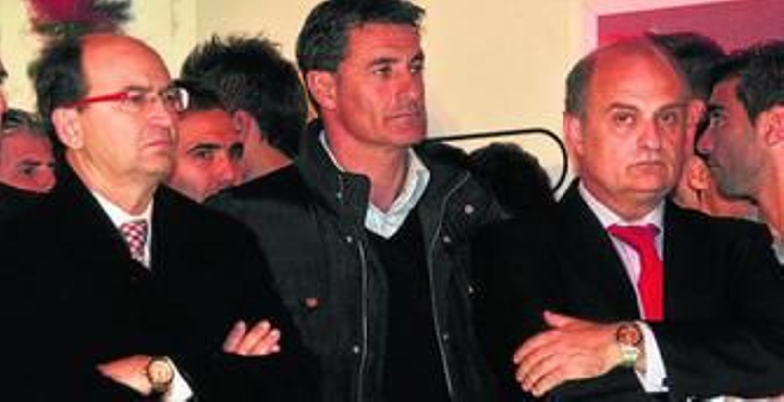 Míchel atiende a las palabras de Del Nido entre José Castro y José María Manzano, durante el acto 'Fieles de Nervión'.