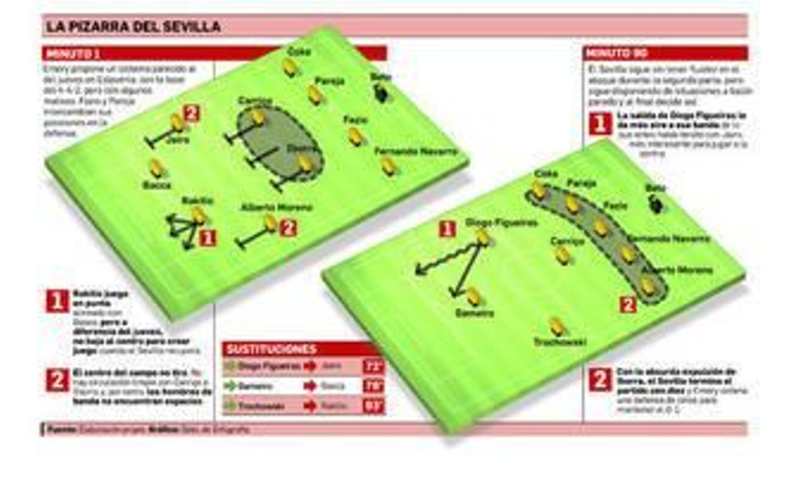 El Sevilla se organizó, como en Eslovenia, en un 4-4-2 puro con Rakitic punta junto a Bacca, con la diferencia de que el suizo-croata no andaba pasos atrás para buscar el balón cuando se trataba de crear. Y, otra diferencia, quizá menos decisiva, pero igual de destacable, el intercambio de posiciones entre Fazio y Pareja, pasando el primero a la izquierda. También iba a influir la elección de los laterales, dos hombres con perfil más defensivo y aptos para el juego aéreo, Coke y Fernando Navarro.
