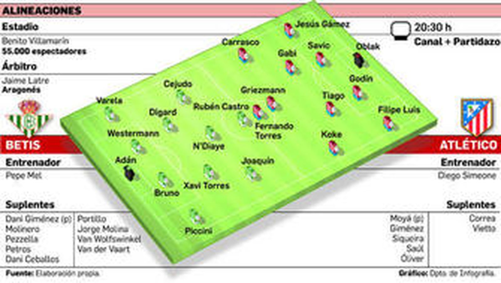 No cambiará en exceso Simeone un once que se recita de memoria. Con la ausencia obligada de Juanfran y Jackson, y con Giménez y Vietto recuperados de sus respectivas lesiones, parece que el técnico argentino apostará por Jesús Gámez, Savic y Fernando Torres en un equipo con Oblak, Godín, Filipe Luis, Tiago, Gabi, Koke, Carrasco y Griezmann, y que incluso se guarda en la recámara balas como las de Saúl y el joven Correa, además del esperado Vietto tras su apendicitis. Casi nada.