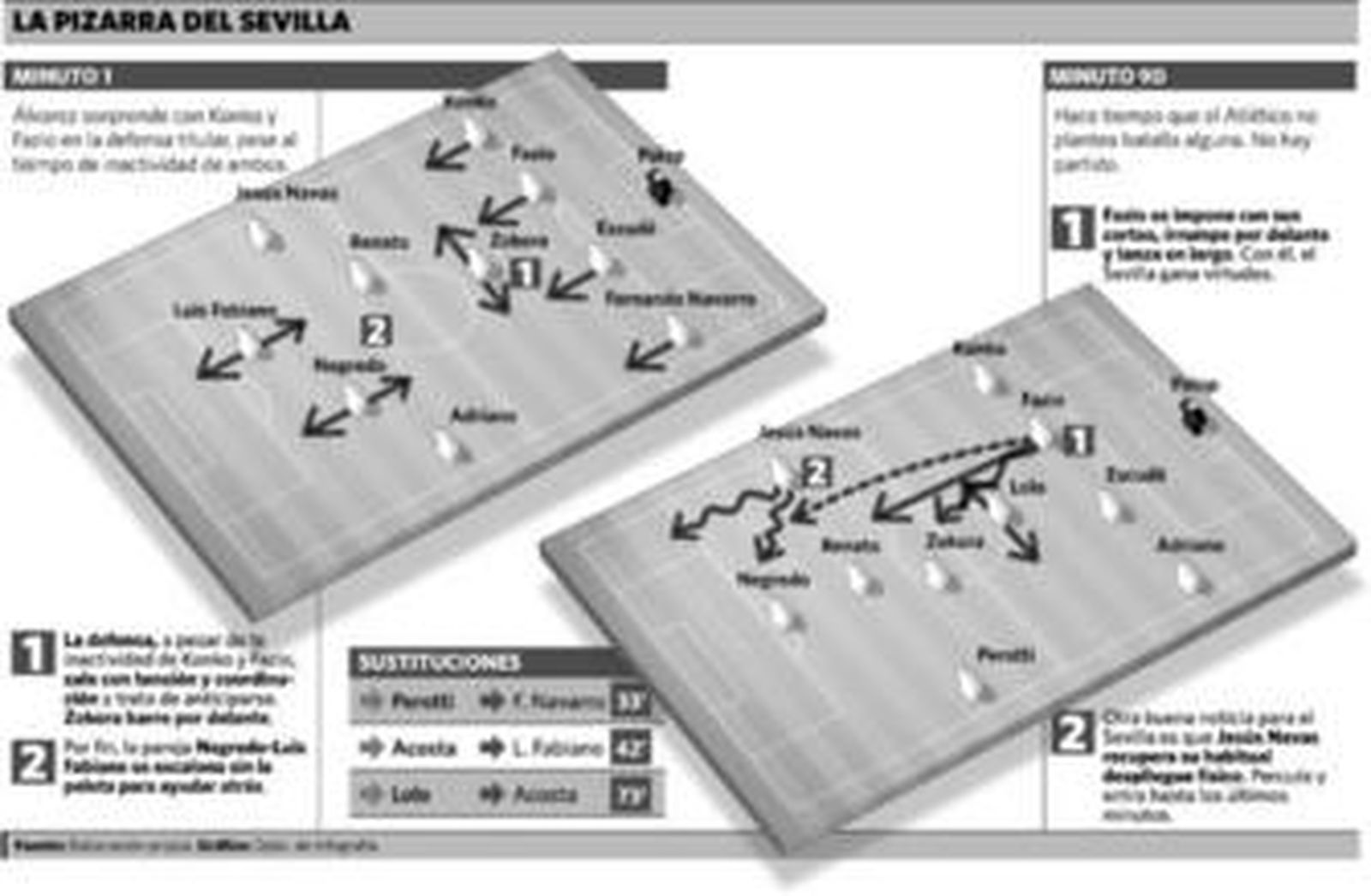 Los goles llegaron más por la impericia de los atléticos en la marca o en el corte que por acciones trenzadas o recursos individuales. Se encontró el Sevilla con un fallo en el despeje de un saque de esquina y dos penaltis, y con el partido de cara todo fue más fácil. Pero no hubo fluidez en la transición defensa-ataque, Luis Fabiano se lesionó en el segundo penalti y Negredo volvió a dar un curso de cómo no debe moverse un delantero para ponerse de remate.