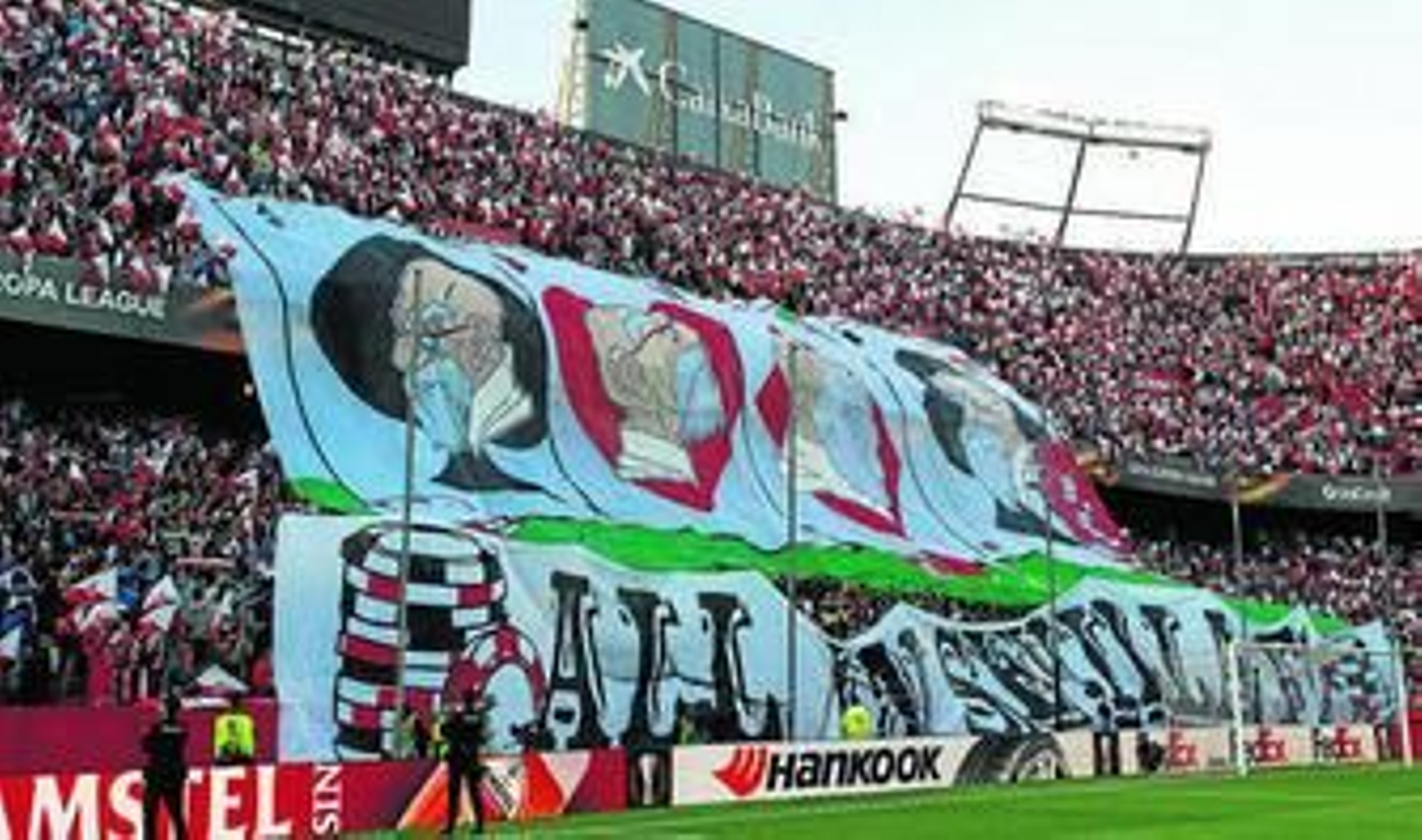 Espectacular imagen del graderío: banderas blanquirrojas y pancarta recordando el póquer de títulos de UEFA.