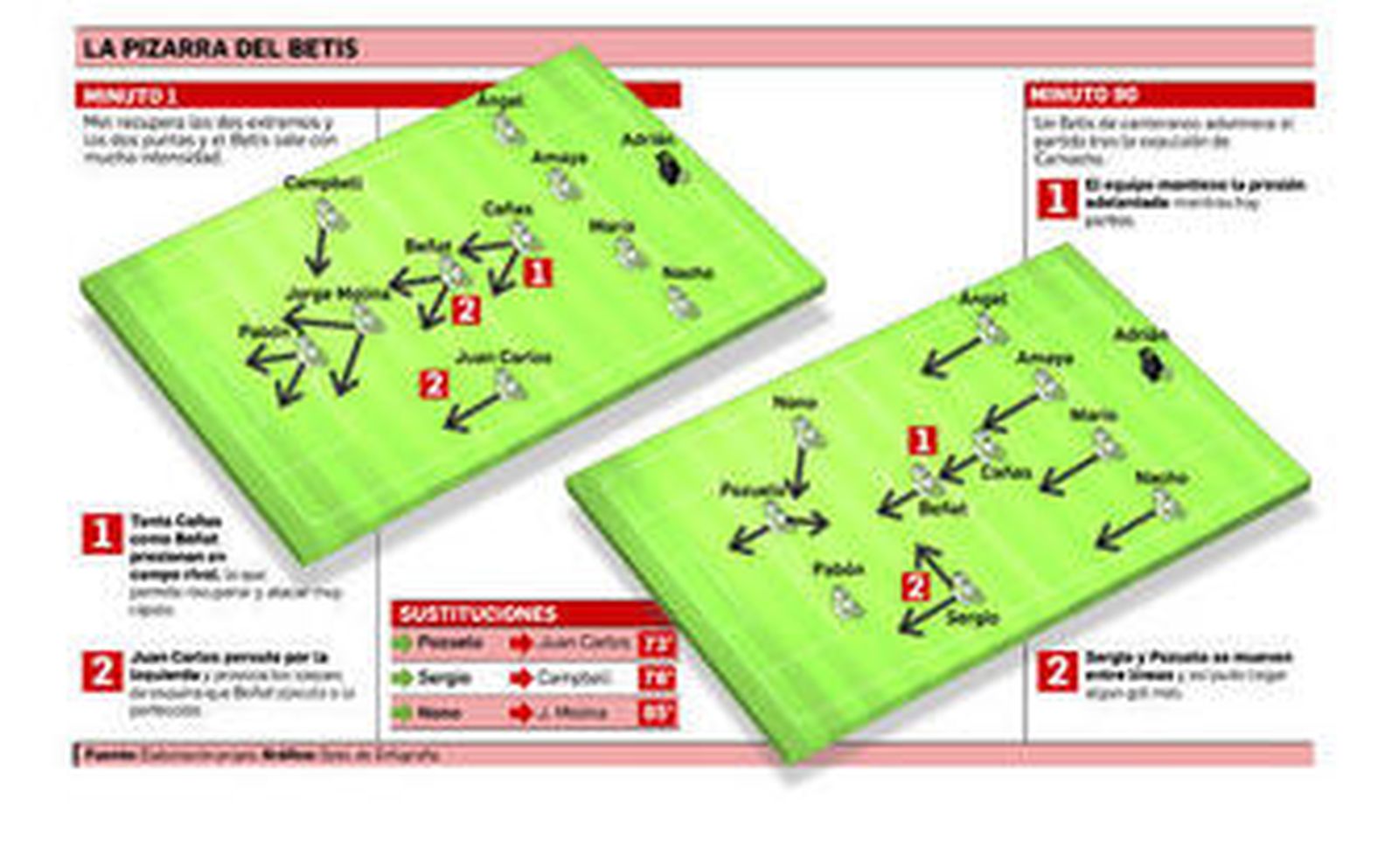 Cuando más complicado se vislumbraba el panorama, tras cinco partidos sin ganar en la segunda vuelta y ante un rival de la zona noble como el Málaga, Pepe Mel regresó a los orígenes, a la manera que mejor le ha funcionado en los últimos tiempos, con un Betis muy agresivo partiendo desde su alineación, con dos extremos, Campbell y Juan Carlos, y dos delanteros, Jorge Molina y Pabón, para que Cañas y Beñat se adueñaran del balón y del partido.