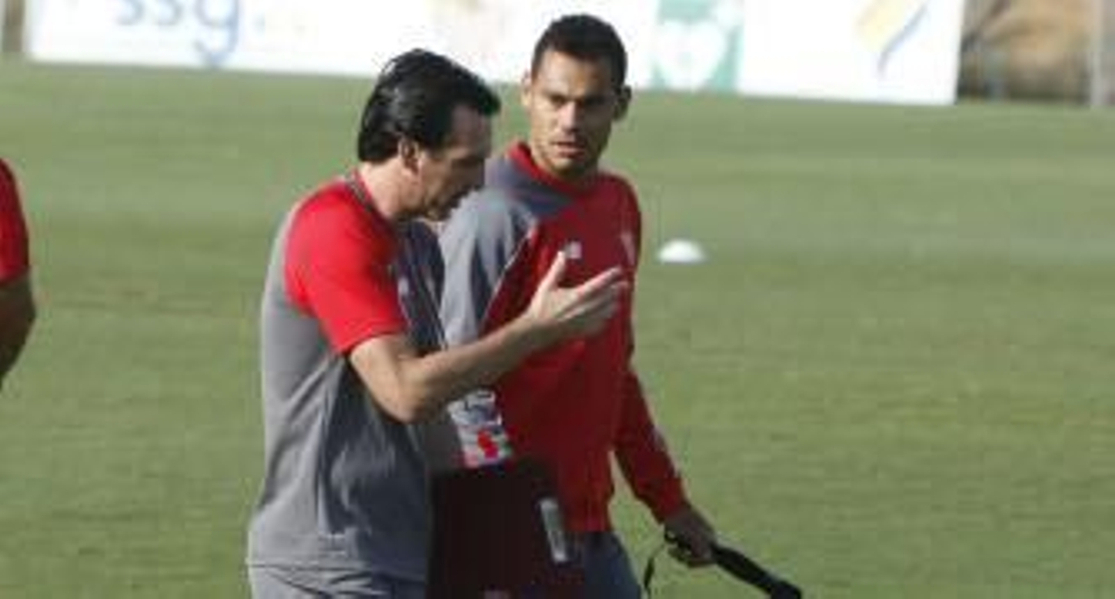 Unai Emery dialoga con Kolodziejczak durante un receso de la sesión de entrenamiento. / José Ángel García