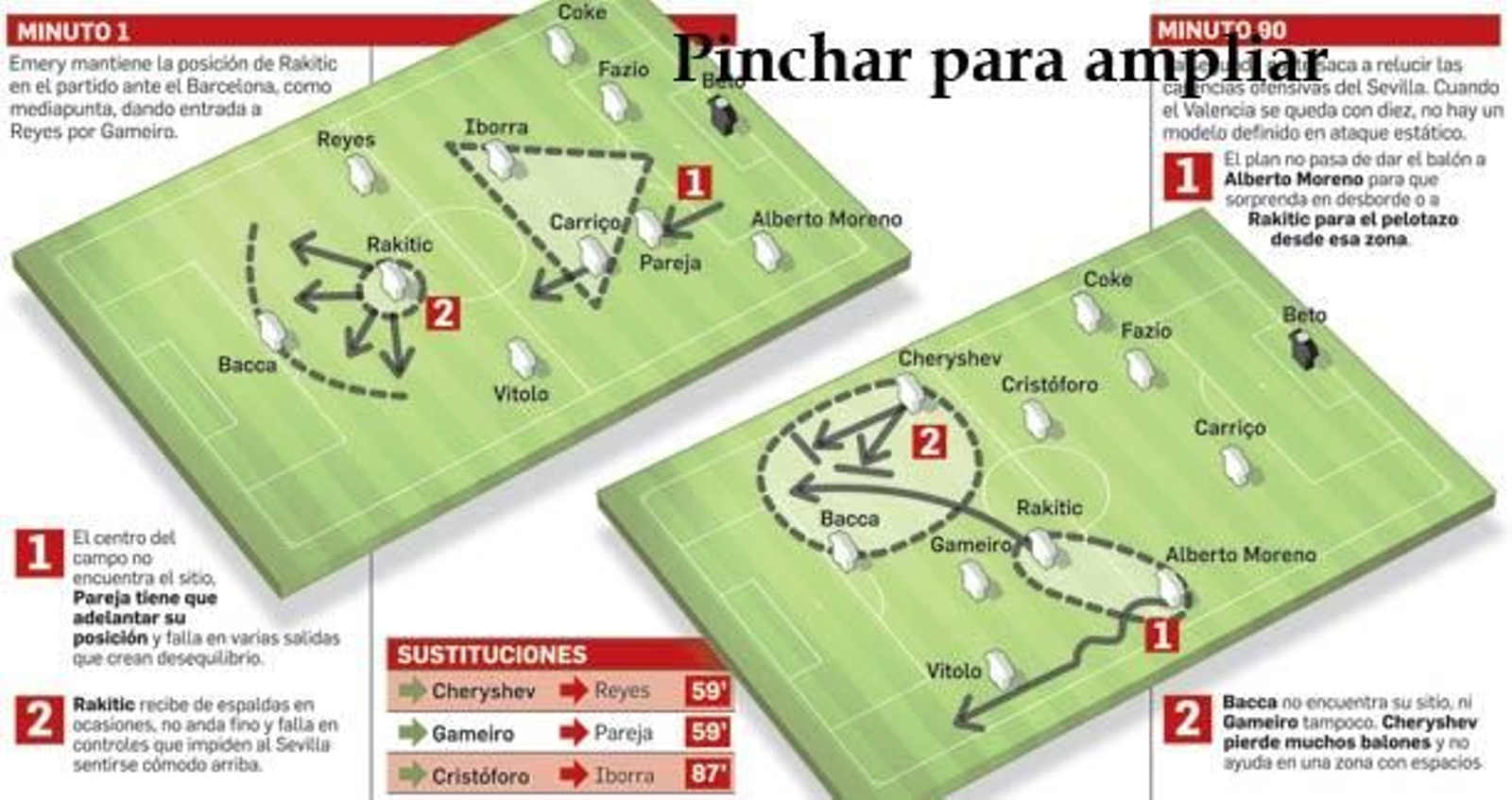Con el paréntesis de la visita del Barcelona, en el que Rakitic adelantó su posición a la mediapunta (como en los partidos fuera de casa), Emery ha pasado en dos encuentros en Nervión de darle todo el mando al suizo-croata para que sacase el balón prácticamente al lado de Beto (ante el Levante) a que, como ayer, esperase el balón arriba. Pero el técnico vasco, viendo que el plan no surtía efecto alguno, se decidió a volver al antiguo plan (o sea, Rakitic de organizador desde atrás) ya cuando el Valencia se quedó con diez, desnudándose entonces un equipo sin ideas en ataque estático y en el que empieza a desquiciarse su estrella con tanto vaivén.