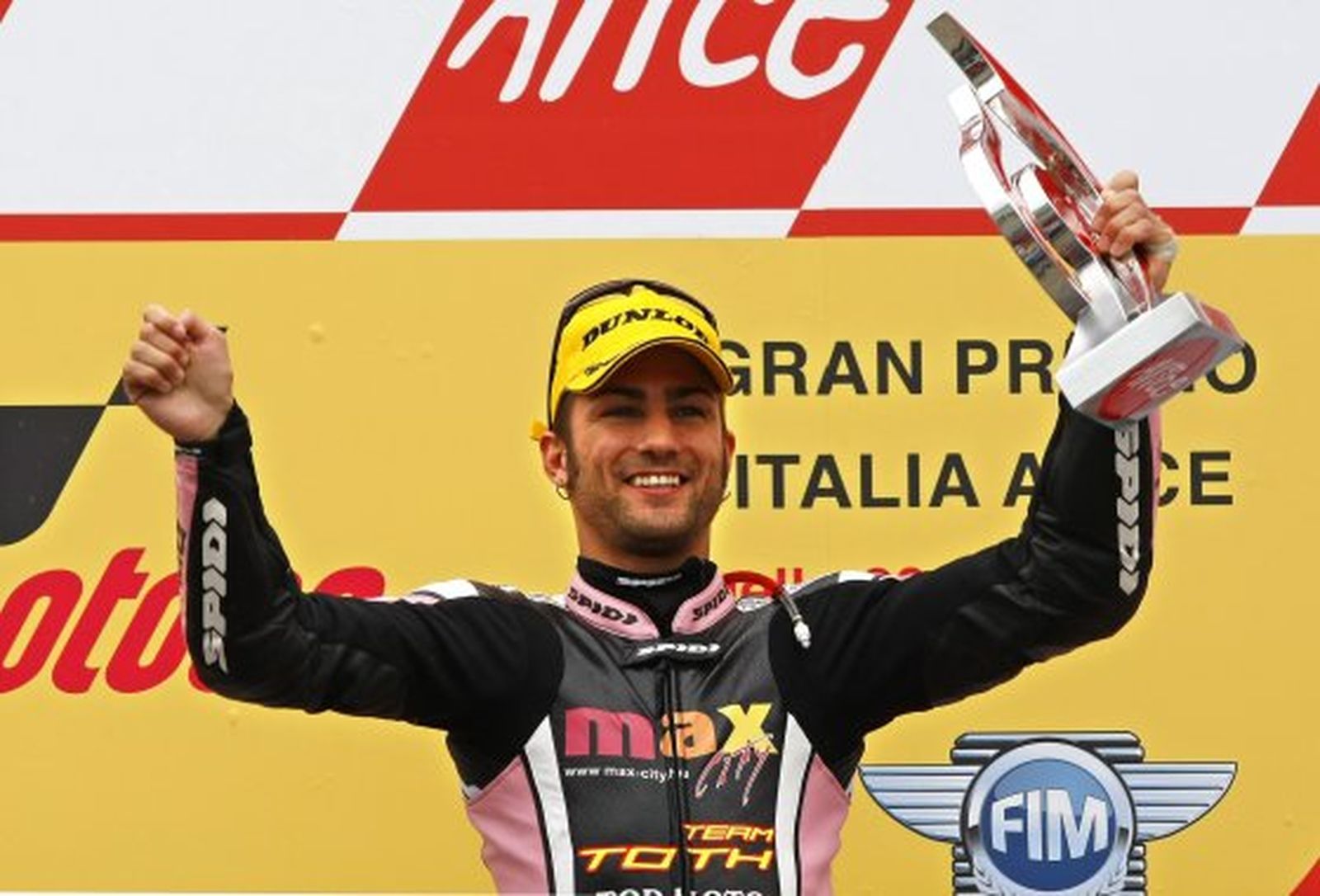 Con el resto de pilotos perdiendo puestos, Simoncelli y Bautista protagonizaron una dura lucha cuando quedaban doce vueltas para el final, y fue el español quien consiguió ponerse a la cabeza, aunque poco después ambos dieron el susto cuando sus motos resbalaron en el mojado circuito italiano.