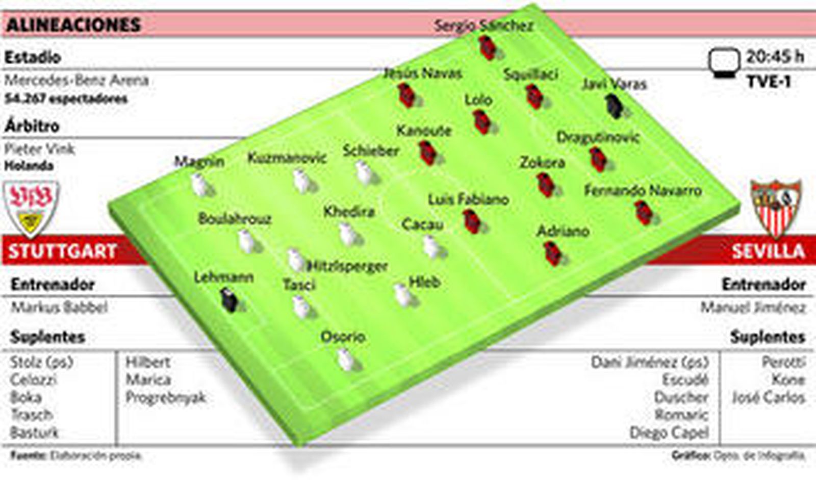 El actual grupo humano del Sevilla es eminentemente ganador y eso se trasluce en todo momento, incluso después de los sinsabores. Las conversaciones entre los profesionales giran en torno a eso, a las ganas de comenzar a disputar cuanto antes este partido frente al Stuttgart. Además, la oportunidad, al menos en teoría, es buena para pescar en esta ciudad alemana. El cuadro que entrena Markus Babbel no ha comenzado bien en la Bundesliga y está atravesando por serias dificultades deportivas. Tantas que el Stuttgart es actualmente el decimotercer clasificado, contabiliza sólo 8 puntos fruto de 2 triunfos, 2 empates y nada menos que 5 derrotas. Son unos números decepcionantes para un equipo que, si bien perdió en verano a Mario Gómez, su gran referente en los últimos años, también es cierto que se reforzó con hombres de cierto nivel económico, y deportivo, tales como el bielorruso Hleb, el serbio Kuzmanovic o el ruso Pogrebnyak. Pero la química no ha aparecido entre ellos y quienes ya estaban, como los internacionales alemanes Lehmann, Khedira, Hitzlsperger o Cacau, y los resultados no pueden ser más decepcionantes.
