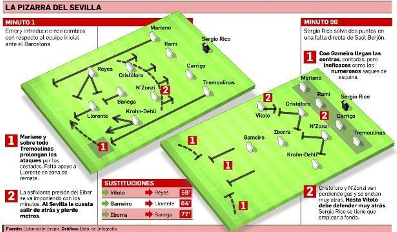 Esta vez Mendilibar sorprendió al mantener el 4-4-2, su esquema habitual en Ipurúa, en lugar del que suele usar fuera de casa, el 4-2-3-1 con Borja como punta de lanza. Junto a la revelación goleadora de la Liga, continuó en vanguardia Sergi Enrich. Y ambos fueron los primeros bastiones que debía superar el Sevilla cuando trata de iniciar la jugada desde atrás en corto, que fue el propósito, no pocas veces, de los pupilos de Emery. Ambos puntas no pararon de hostigar a los centrales o a los pivotes, mientras que le secundaban Escalante -medio centro defensivo desplazado ayer a la derecha- y Adrián más abiertos, e incluso Radocevic, con Dani García más anclado por detrás.
