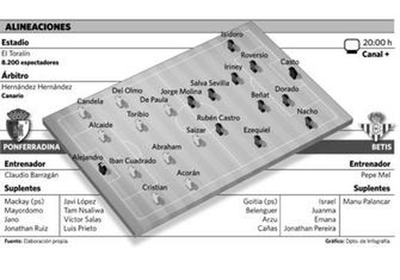 Apenas alberga Mel dudas en su once y se mantiene en su idea de que jueguen los futbolistas más en forma. Con la duda de qué pasará con Emana y con la segura inclusión de Salva Sevilla por Jonathan Pereira, el equipo no variará apenas del que venció al Albacete. Planea sobre el ambiente un posible descaso a Rubén Castro. Si el camerunés da el visto bueno…