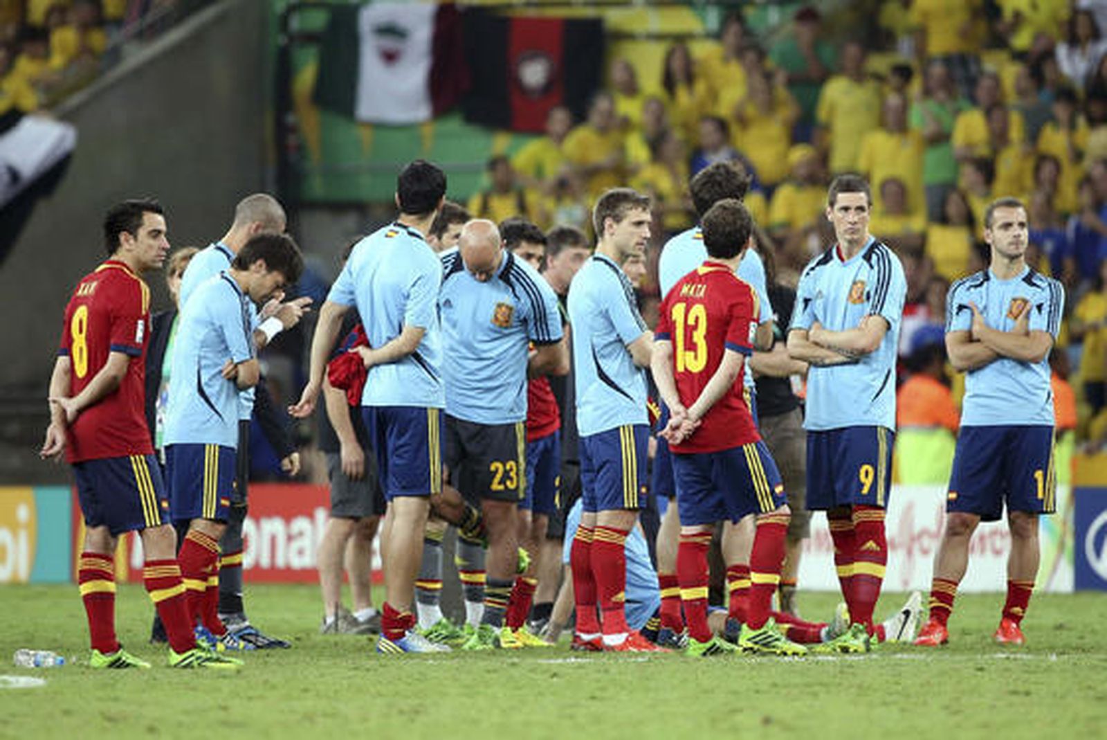 Después de tres finales seguidas ganadas, los jugadores españoles estuvieron el domingo del otro lado. La cara seria sobre el césped era la suya. Los que cantaban y bailaban al ritmo marcado por el defensa Dante tocando su pandero eran los brasileños. Los niños que correteaban sobre el césped junto a sus padres llevaban camisetas amarillas. "No estamos acostumbrados", admitió Xavi después de festejar dos Eurocopas (2008 y 2012) y un Mundial (2010) seguidos.