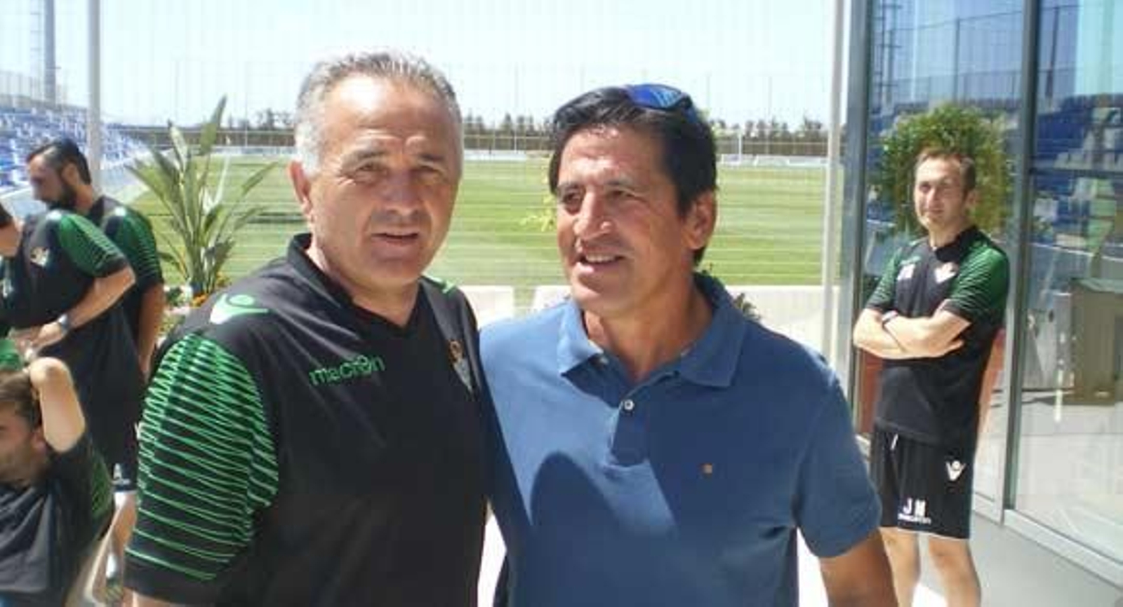 Gordillo y Aquino rememoran el ascenso que lograron juntos, en la visita del delantero al entrenamiento bético.