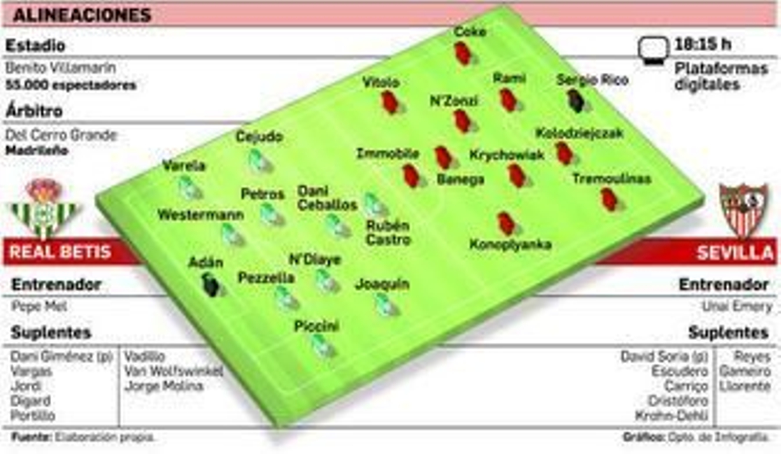 En las filas nervionenses quien no estará es Iborra por la sanción acarreada por su absurda expulsión contra el Logroñés, más incomprensible aún si se tiene en cuenta que la eliminatoria registraba en ese momento un 6-0 favorable a los suyos. Tampoco fue incluido por Emery en la relación de 19 convocados para este encuentro Mariano, titular en las últimas jornadas en el lateral derecho y que esta vez le cederá su puesto a Coke. A tenor de la alineación confeccionada por Emery el pasado sábado frente al Granada, no sería descartable que el equipo estuviera muy refrescado con la presencia de los laterales Coke y Tremoulinas; N'Zonzi en el centro del campo; Banega en la construcción; Konoplyanka en uno de los extremos y hasta Immobile, que podría ser el delantero en estas rotaciones. ¿Carriço? Todo dependerá de su estado físico, algo que tanto se oculta en los entrenamientos a puerta cerrada, pero si su tonoen este sentido es el adecuado tampoco sería una quimera verlo de central junto a Rami.