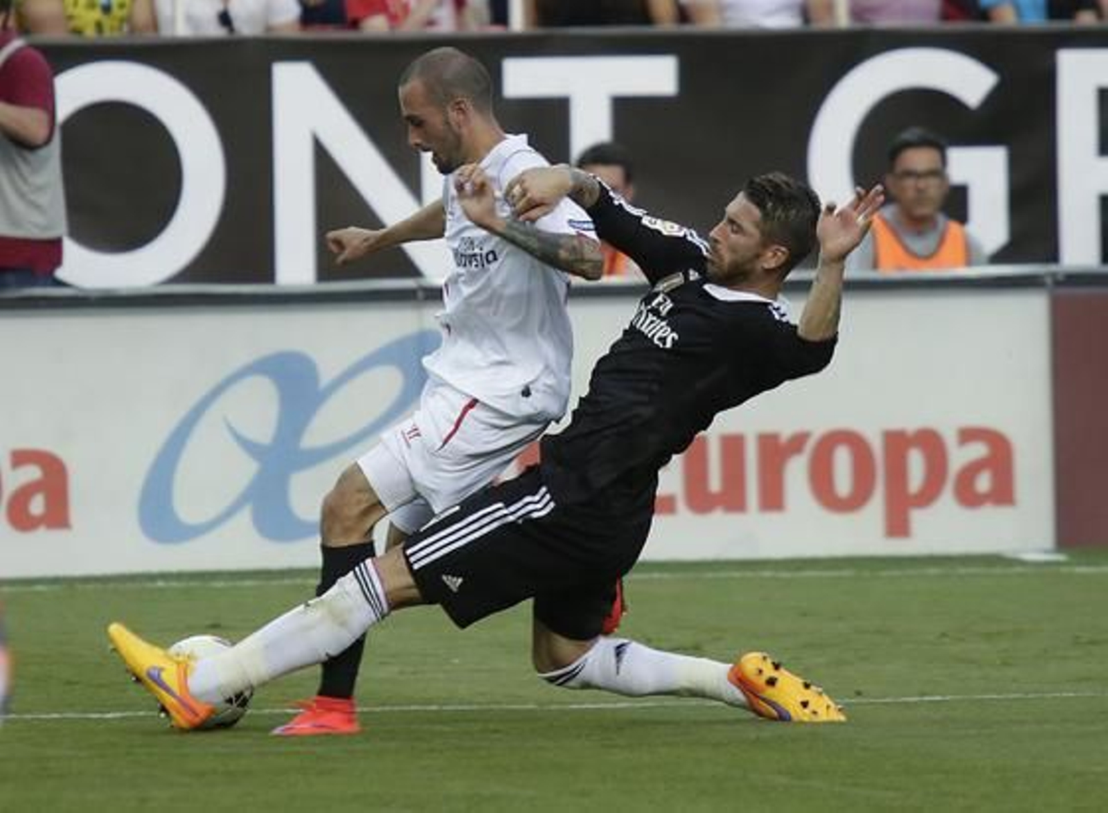 La decisión de meter juntos a Reyes y Banega le hizo mucho daño al Madrid en una zona en la que Emery sabía que Ancelotti iba a colocar a Sergio Ramos. El balón fue siempre del Sevilla en esa zona y en el acoso inicial lo que le faltó fue estar más atento al paso adelante con que la zaga del Madrid, en movimientos muy bien coordinados y trabajados, dejaba en fuera de juego a Bacca. Luego, cuando entró una pieza de ataque por Figueiras, el acoso local fue mayor.