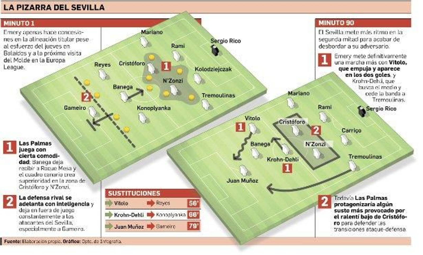 El entrenador sevillista corrigió este detalle con la entrada de Krohn-Dehli para que se pegara a la zona central, pero cuando ello sucedió ya había pasado más de una hora y Las Palmas ya había dado algún susto. Además de ello, los repliegues empezaron a hacerse con más velocidad en las transiciones ataque-defensa, aunque el ritmo menor de Cristóforo provocó algún desequilibrio en estas situaciones ante gente rápida como Jonathan Viera o con habilidad como Tana.